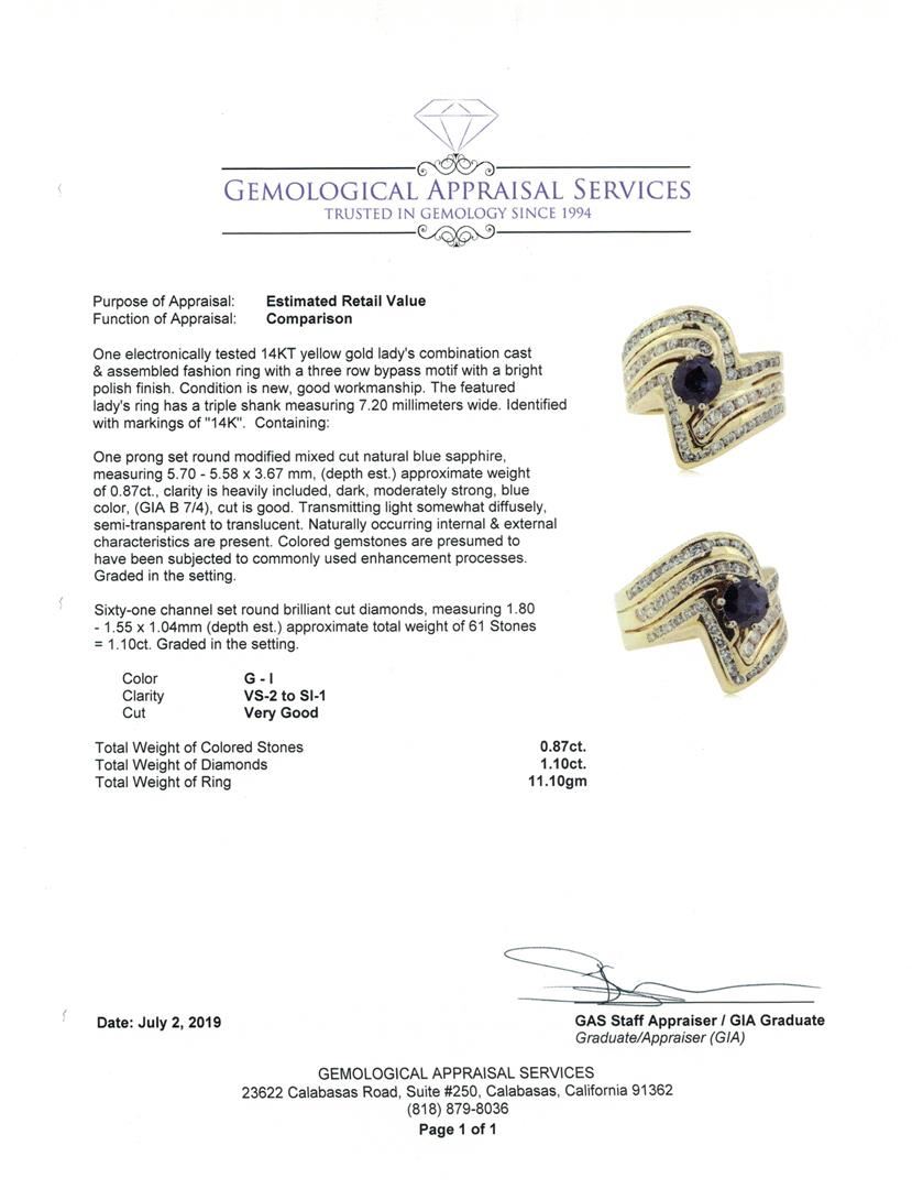 One electronically tested 14KT yellow gold lady's combination cast & assembled fashion ring with a three row bypass motif with a bright polish finish. The featured lady's ring has a triple shank measuring 7.20 millimeters wide. Identified with markings of '14K'. Condition is new, good workmanship. Containing: One prong set round modified mixed cut natural blue sapphire, measuring 5.70 - 5.58 x 3.67 mm, (depth est.) approximate weight of 0.87ct., clarity is heavily included, dark, moderately strong, blue color, (GIA B 7/4), cut is good. Transmitting light somewhat diffusely, semi-transparent to translucent. Naturally occurring internal & external characteristics are present. Colored gemstones are presumed to have been subjected to commonly used enhancement processes. Graded in the setting. Sixty-One channel set round brilliant cut diamonds, measuring 1.80 - 1.55 x 1.04mm (depth est.) approximate total weight of 61 Stones = 1.10ct. Graded in the setting. Color G - I Clarity VS-2 to SI-1 Cut Very Good. Total Weight of Colored Stones 0.87ct.. Total Weight of Diamonds 1.10ct.. Total Weight of Ring 11.10gm GAS Appraised at $5020.00. GAS Appraised at $5,020.00.