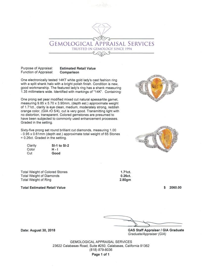 One electronically tested 14KT white gold lady's cast fashion ring with a split shank halo with a bright polish finish. The featured lady's ring has a shank measuring 1.35 millimeters wide. Identified with markings of '14K'. Condition is new, good workmanship. Containing: One prong set pear modified mixed cut natural spessartite garnet, measuring 9.85 x 5.70 x 3.90mm, (depth est.) approximate weight of 1.71ct., clarity is eye clean, medium, moderately strong, reddish orange color, (GIA rO 5/4), cut is very good. Transmitting light with no distortion, transparent. Colored gemstones are presumed to have been subjected to commonly used enhancement processes. Graded in the setting. Sixty-Five prong set round brilliant cut diamonds, measuring 1.00 - 0.95 x 0.61mm (depth est.) approximate total weight of 65 Stones = 0.26ct. Graded in the setting. Color H - I Clarity SI-1 to SI-2 Cut Good. Total Weight of Colored Stones 1.71ct.. Total Weight of Diamonds 0.26ct.. Total Weight of Ring 2.80gm GAS Appraised at $2060.00. GAS Appraised at $2,060.00.
