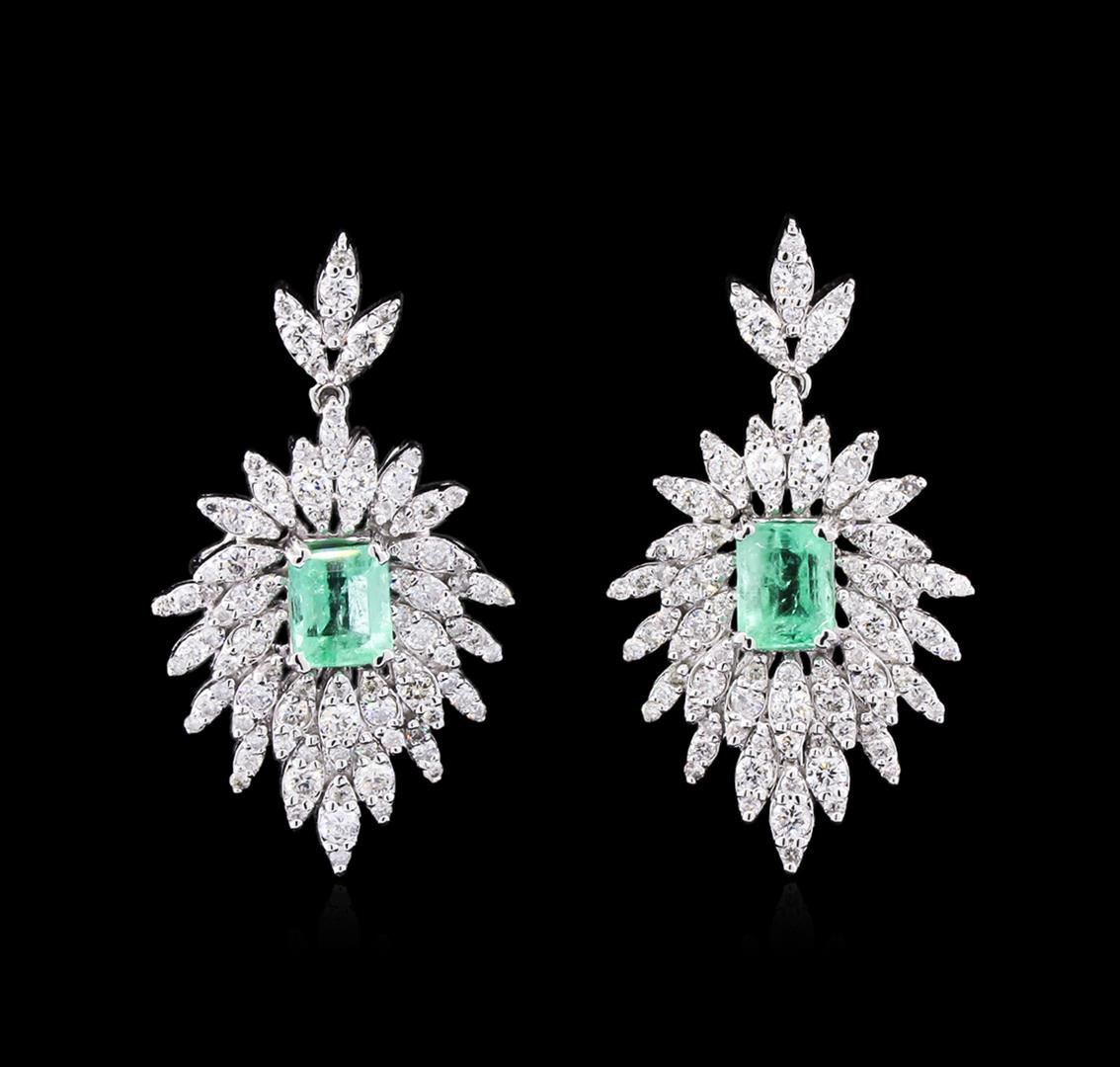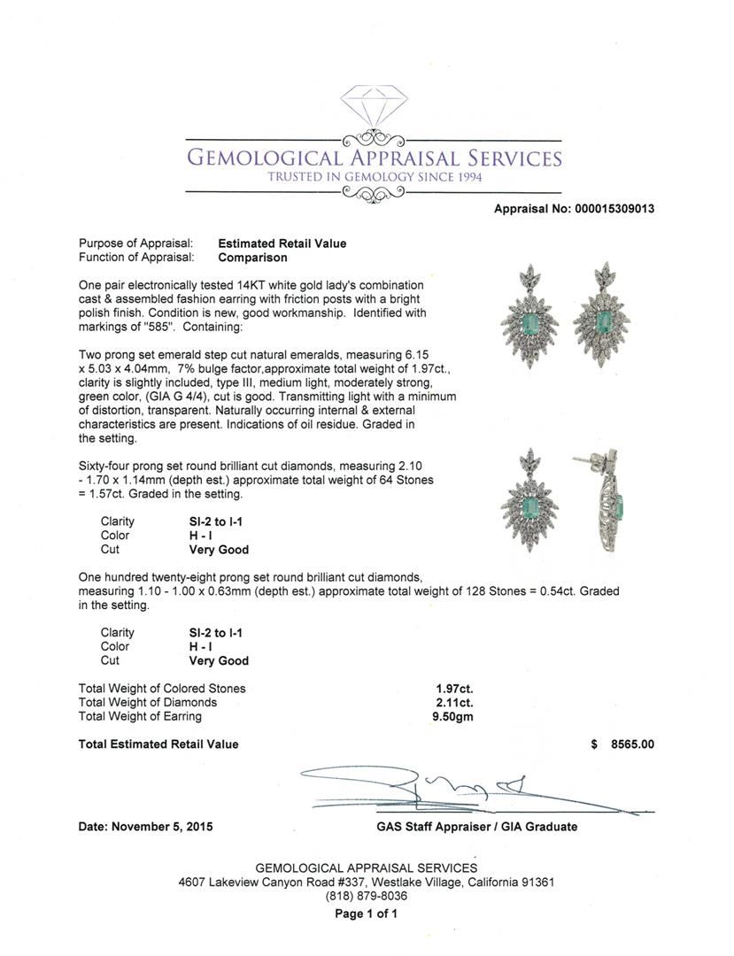 One pair electronically tested 14KT white gold lady's combination cast & assembled fashion earring with friction posts with a bright polish finish. Identified with markings of "585". Condition is new, good workmanship. Containing: Two prong set emerald step cut natural emeralds, measuring 6.15 x 5.03 x 4.04mm, 7% bulge factor, approximate total weight of 1.97ct., clarity is slightly included, type III, medium light, moderately strong, green color, (GIA G 4/4), cut is good. Transmitting light with a minimum of distortion, transparent. Naturally occurring internal & external characteristics are present. Indications of oil residue. Graded in the setting. Sixty-Four prong set round brilliant cut diamonds, measuring 2.10 - 1.70 x 1.14mm (depth est.) approximate total weight of 64 Stones = 1.57ct. Graded in the setting. Clarity: SI-2 to I-1. Color: H - I. Cut Very Good One Hundred Twenty-Eight prong set round brilliant cut diamonds, measuring 1.10 - 1.00 x 0.63mm (depth est.) approximate total weight of 128 Stones = 0.54ct. Graded in the setting. Clarity: SI-2 to I-1. Color: H - I. Cut Very Good. Total Weight of Colored Stones 1.97ct. Total Weight of Diamonds 2.11ct. Total Weight of Earring 9.50gm. GAS Appraised at $8,565.00.