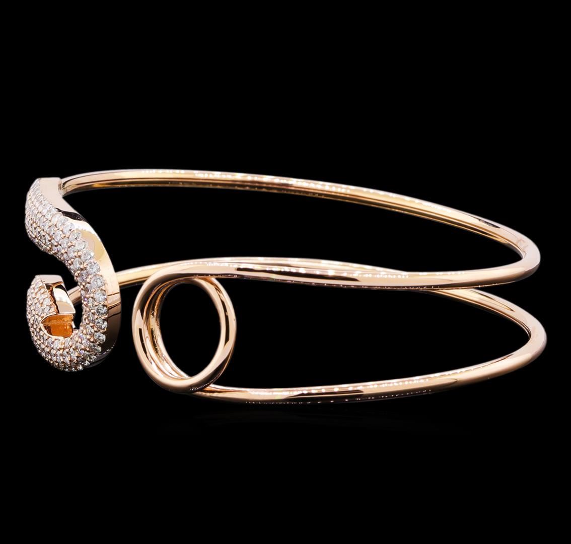 One electronically tested 14KT rose gold lady's combination cast & assembled fashion cuff bracelet with a bright polish finish. The featured lady's bracelet has a safety pin motif and measures 7 inches in length. Identified with markings of "K14". Condition is new, good workmanship. Containing: Forty prong set round brilliant cut diamonds, measuring 1.40 - 1.30 x 0.84mm (depth est.) approximate total weight of 40 Stones = 0.38ct. Graded in the setting. Clarity: SI-1 to SI-2. Color: H - I. Cut Good One Hundred Ten prong set round brilliant cut diamonds, measuring 1.60 - 1.55 x 0.96mm (depth est.) approximate total weight of 110 Stones = 1.60ct. Graded in the setting. Clarity: SI-1 to SI-2. Color: H - I. Cut Good. Total Weight of Diamonds 1.98ct. Total Weight of Cuff Bracelet 15.20gm. GAS Appraised at $7,950.00.