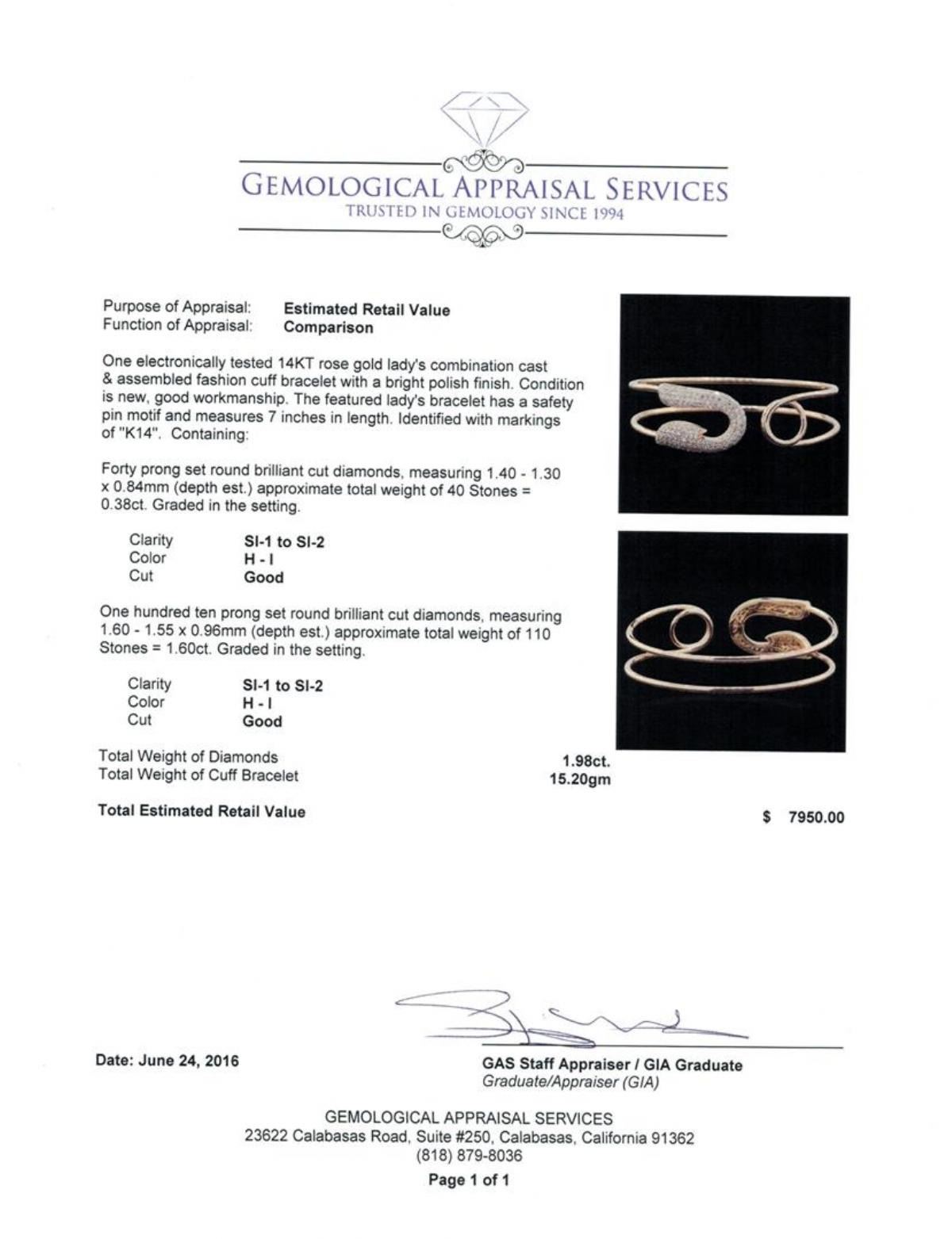 One electronically tested 14KT rose gold lady's combination cast & assembled fashion cuff bracelet with a bright polish finish. The featured lady's bracelet has a safety pin motif and measures 7 inches in length. Identified with markings of "K14". Condition is new, good workmanship. Containing: Forty prong set round brilliant cut diamonds, measuring 1.40 - 1.30 x 0.84mm (depth est.) approximate total weight of 40 Stones = 0.38ct. Graded in the setting. Clarity: SI-1 to SI-2. Color: H - I. Cut Good One Hundred Ten prong set round brilliant cut diamonds, measuring 1.60 - 1.55 x 0.96mm (depth est.) approximate total weight of 110 Stones = 1.60ct. Graded in the setting. Clarity: SI-1 to SI-2. Color: H - I. Cut Good. Total Weight of Diamonds 1.98ct. Total Weight of Cuff Bracelet 15.20gm. GAS Appraised at $7,950.00.