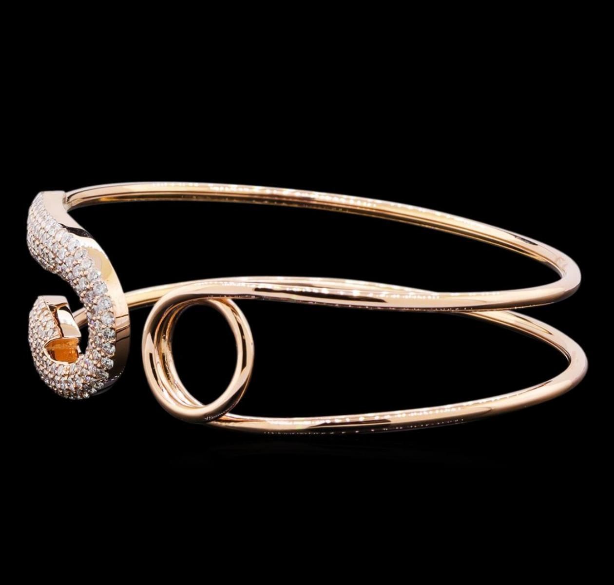 One electronically tested 14KT rose gold lady's combination cast & assembled fashion cuff bracelet with a bright polish finish. The featured lady's bracelet has a safety pin motif and measures 7 inches in length. Identified with markings of "K14". Condition is new, good workmanship. Containing: Forty prong set round brilliant cut diamonds, measuring 1.40 - 1.30 x 0.84mm (depth est.) approximate total weight of 40 Stones = 0.38ct. Graded in the setting. Clarity: SI-1 to SI-2. Color: H - I. Cut Good One Hundred Ten prong set round brilliant cut diamonds, measuring 1.60 - 1.55 x 0.96mm (depth est.) approximate total weight of 110 Stones = 1.60 ct. Graded in the setting. Clarity: SI-1 to SI-2. Color: H - I. Cut Good. Total Weight of Diamonds 1.98ct. Total Weight of Cuff Bracelet 15.20gm. GAS Appraised.