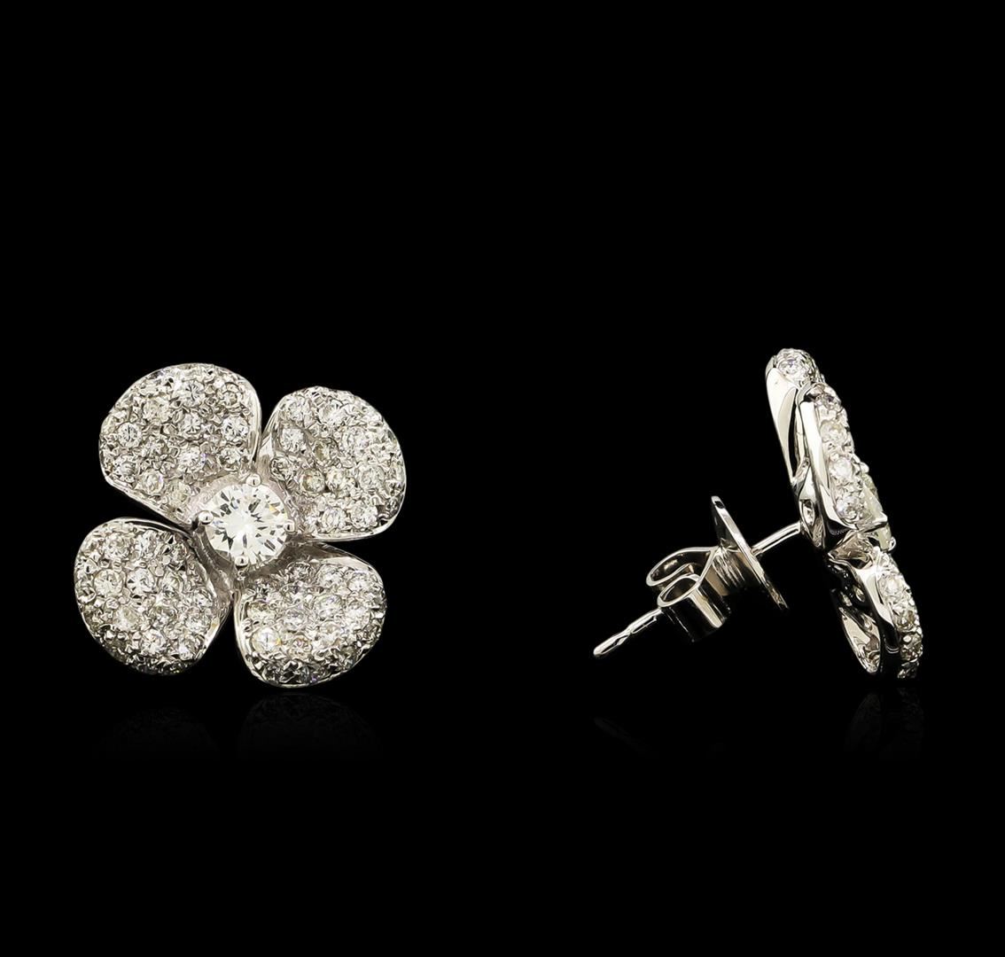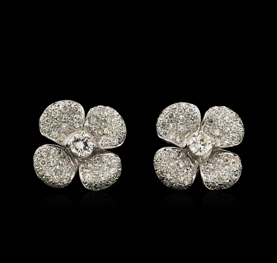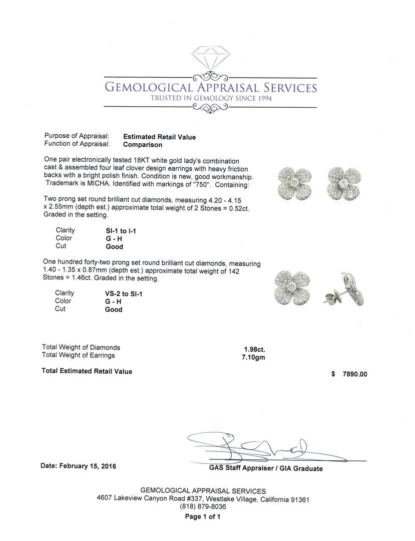 One pair electronically tested 18KT white gold lady's combination cast & assembled four leaf clover design earrings with heavy friction backs with a bright polish finish. Trademark is MICHA. Identified with markings of "750". Condition is new, good workmanship. Containing: Two prong set round brilliant cut diamonds, measuring 4.20 - 4.15 x 2.55mm (depth est.) approximate total weight of 2 Stones = 0.52ct. Graded in the setting. Clarity: SI-1 to I-1. Color: G - Good One Hundred Forty-Two prong set round brilliant cut diamonds, measuring 1.40 - 1.35 x 0.87mm (depth est.) approximate total weight of 142 Stones = 1.46ct. Graded in the setting. Clarity: VS-2 to SI-1. Color: G - Good. Total Weight of Diamonds 1.98ct. Total Weight of Earrings 7.10gm. GAS Appraised at $7,890.00.