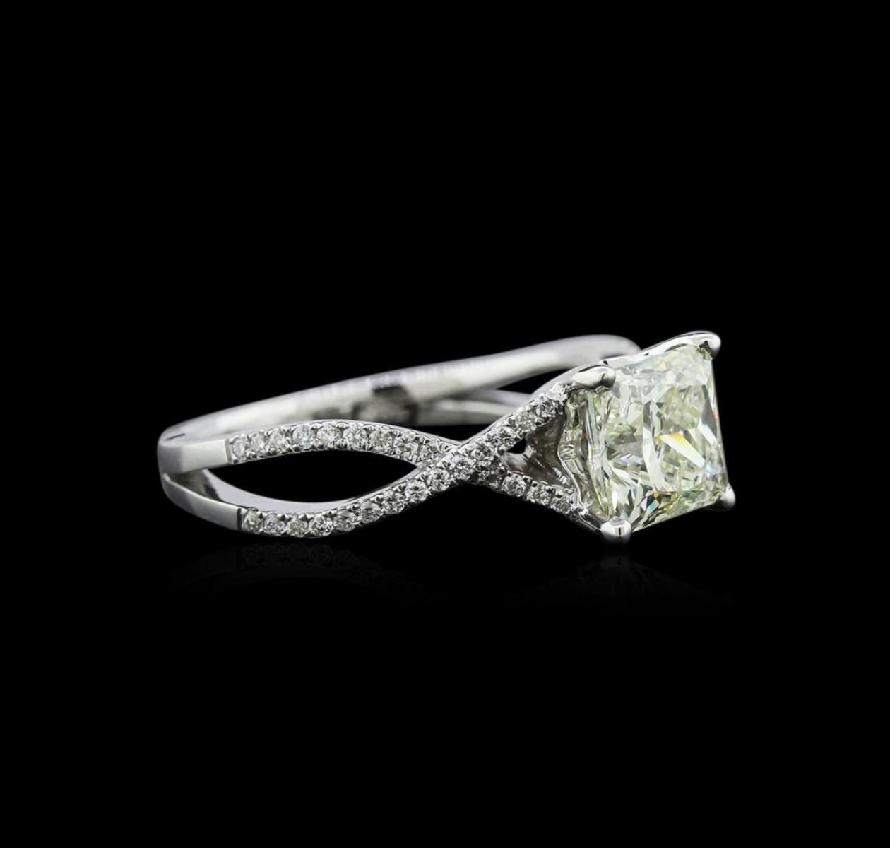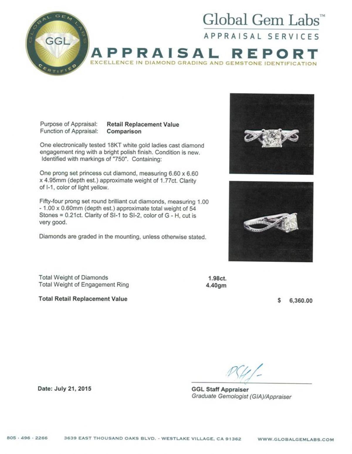One electronically tested 18KT white gold ladies cast diamond engagement ring with a bright polish finish. Identified with markings of "750". Condition is new. Containing: One prong set princess cut diamond, measuring 6.60 x 6.60 x 4.95mm (depth est.) approximate weight of 1.77ct. Clarity: I-1. Fifty-Four prong set round brilliant cut diamonds, measuring 1.00 - 1.00 x 0.60mm (depth est.) approximate total weight of 54 Stones = 0.21ct. Clarity: SI-1 to SI-2. Color: G - H, Cut is Very Good. Diamonds are graded in the mounting, unless otherwise stated. Total Weight of Diamonds 1.98ct. Total Weight of Engagement Ring 4.40gm. GGL Appraised at $6,360.00.
