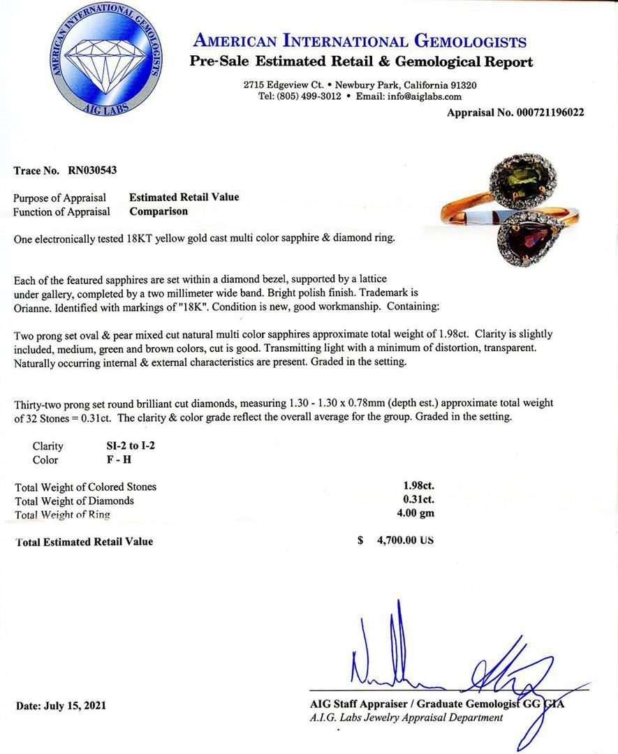 One electronically tested 18KT yellow gold cast multi color sapphire & diamond ring. Each of the featured sapphires are set within a diamond bezel, supported by a lattice under gallery, completed by a two millimeter wide band. Bright polish finish. Trad
