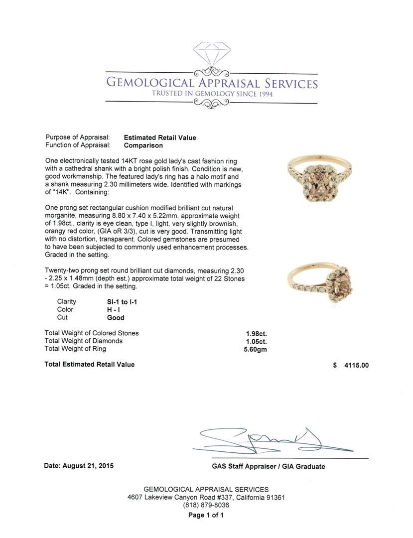 One electronically tested 14KT rose gold lady's cast fashion ring with a cathedral shank with a bright polish finish. The featured lady's ring has a halo motif and a shank measuring 2.30 millimeters wide. Identified with markings of "14K". Condition is new, good workmanship. Containing: One prong set rectangular cushion modified brilliant cut natural morganite, measuring 8.80 x 7.40 x 5.22mm, approximate weight of 1.98ct., clarity is eye clean, type I, light, very slightly brownish, orangy red color, (GIA oR 3/3), cut is very good. Transmitting light with no distortion, transparent. Colored gemstones are presumed to have been subjected to commonly used enhancement processes. Graded in the setting. Twenty-Two prong set round brilliant cut diamonds, measuring 2.30 - 2.25 x 1.48mm (depth est.) approximate total weight of 22 Stones = 1.05ct. Graded in the setting. Clarity: SI-1 to I-1. Color: H - I. Cut Good. Total Weight of Colored Stones 1.98ct. Total Weight of Diamonds 1.05ct. Total Weight of Ring 5.60gm. GAS Appraised at $4,115.00.