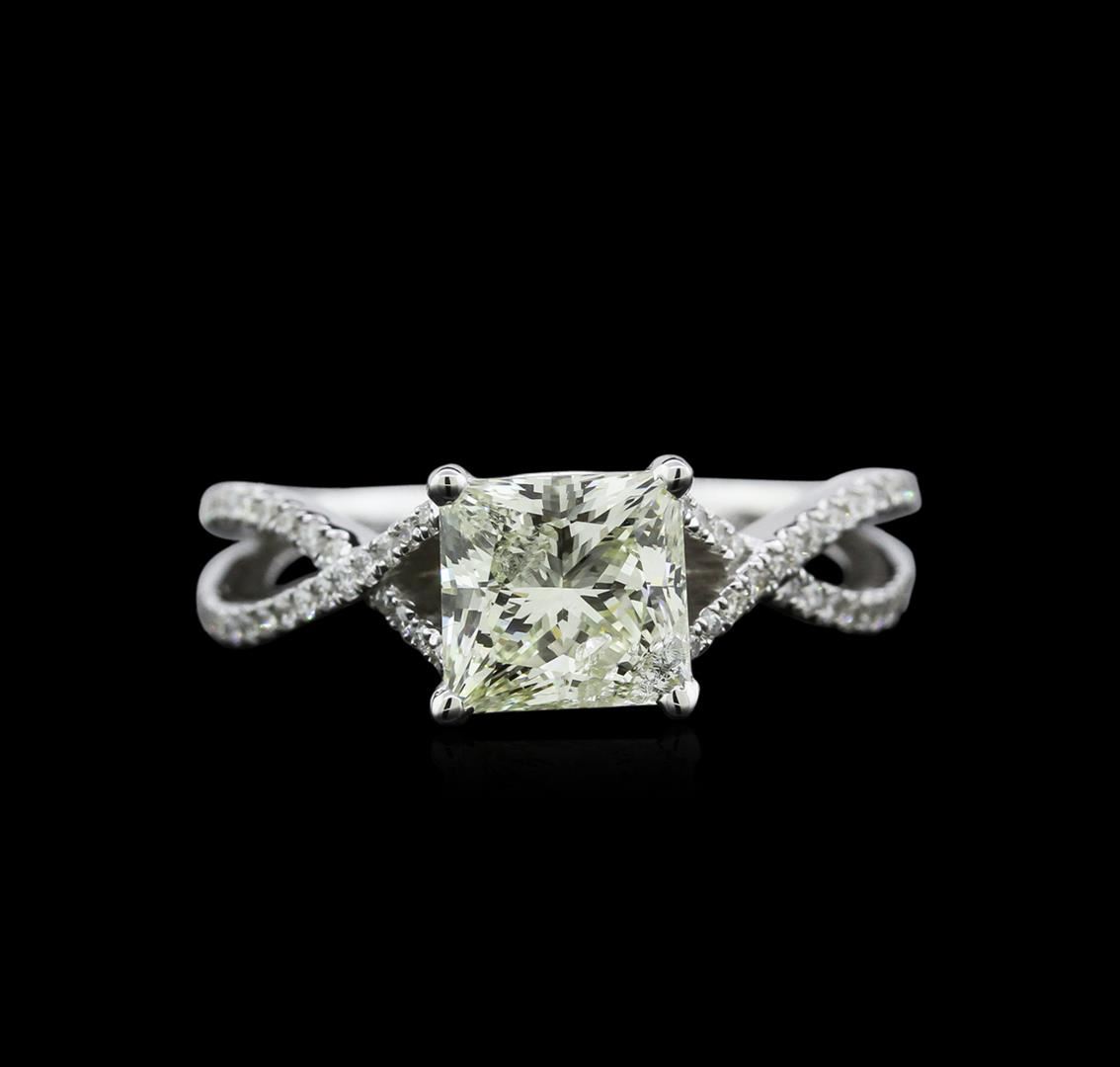 One electronically tested 18KT white gold ladies cast diamond engagement ring with a bright polish finish. Identified with markings of "750". Condition is new. Containing: One prong set princess cut diamond, measuring 6.60 x 6.60 x 4.95mm (depth est.) approximate weight of 1.77ct. Clarity: I-1. Fifty-Four prong set round brilliant cut diamonds, measuring 1.00 - 1.00 x 0.60mm (depth est.) approximate total weight of 54 Stones = 0.21ct. Clarity: SI-1 to SI-2. Color: G - H, Cut is Very Good. Diamonds are graded in the mounting, unless otherwise stated. Total Weight of Diamonds 1.98ct. Total Weight of Engagement Ring 4.40gm. GGL Appraised at $6,360.00.