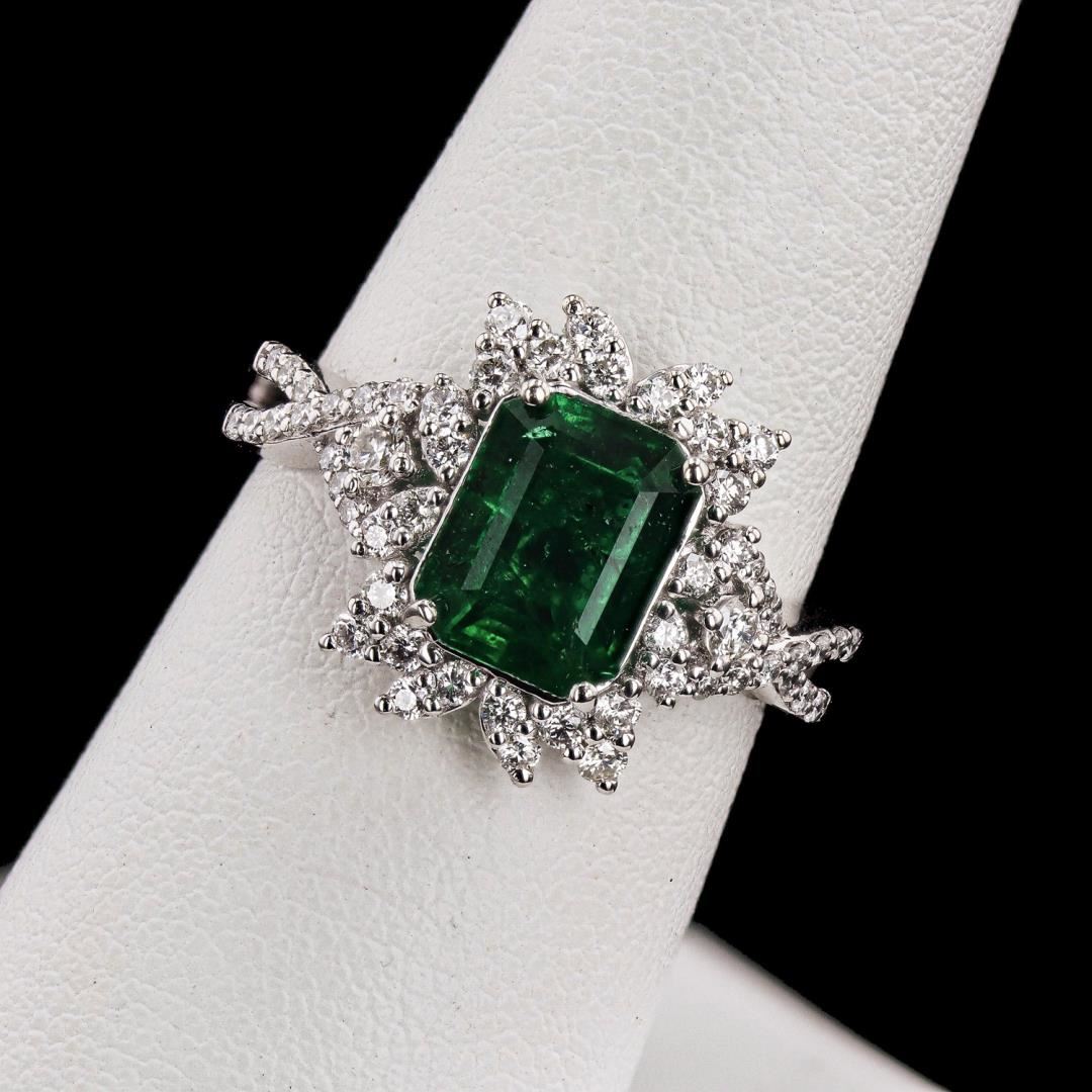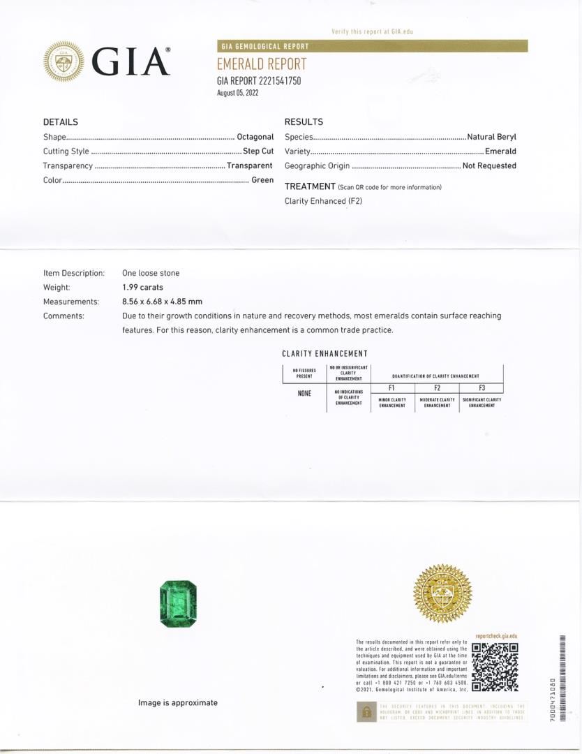 One polished, stamped, and tested platinum ring marked Oscar Friedman. The ring is mounted with 1 genuine GIA certified emerald center stone weighing 1.99 carats, and 52 genuine round diamonds weighing approximately 0.57 carats. This item weighs 7.0 grams, condition is new, excellent workmanship. #MAIN GEMSTONE# GIA Report No.: 2221541750 Species: Natural Beryl Variety: Emerald Shape: Octagonal Cutting Style: Step Cut Measurements: 8.56 X 6.68 x 4.85mm Weight: 1.99 carats Color: Green Transparency: Transparent Treatment: Clarity Enhanced (F2) Refractive Index: 1.564 - 1.595 DR Birefringence: 0.005 to 0.009 Hardness: 7.5 - 8 #ADJACENT GEMSTONES ON RING# Identity: Natural Diamond Shape: Round Cutting Style: Brilliant Cut Quantity: 52 Diamonds Measurements: 1.0 - 2.2mm Total Weight 0.57 carats Color Grade: F - G Clarity Grade: VS2 - SI1 Refractive Index: 2.417 Hardness: 10 EMERALD WEIGHT: 1.99 ct TOTAL DIAMOND WEIGHT: 0.57 cts WEIGHT OF ITEM: 7.0 grams METAL: Platinum