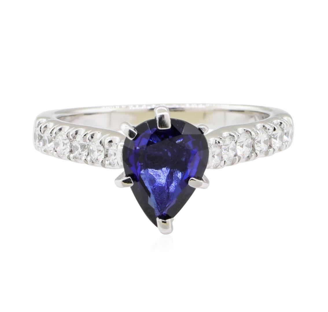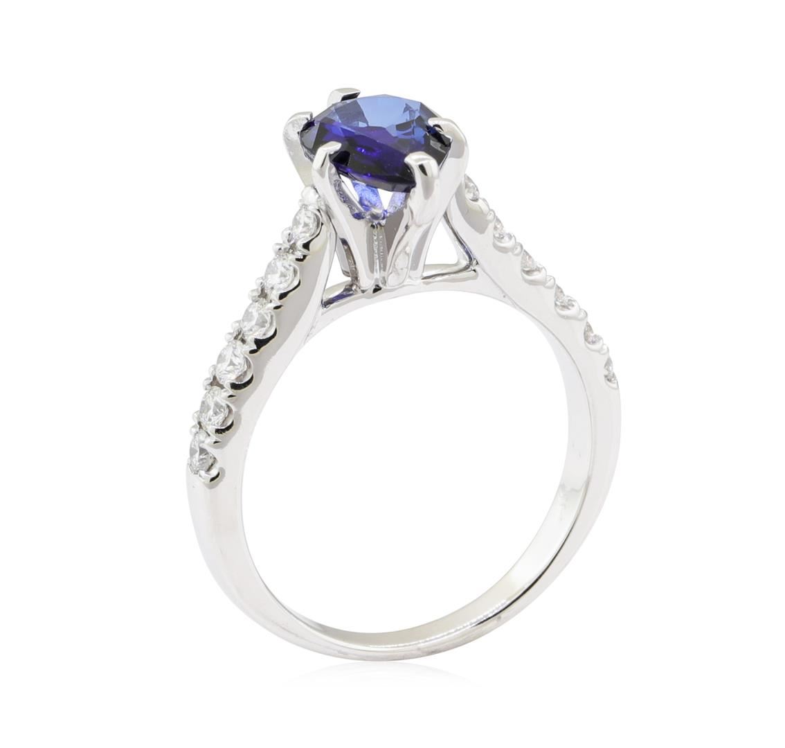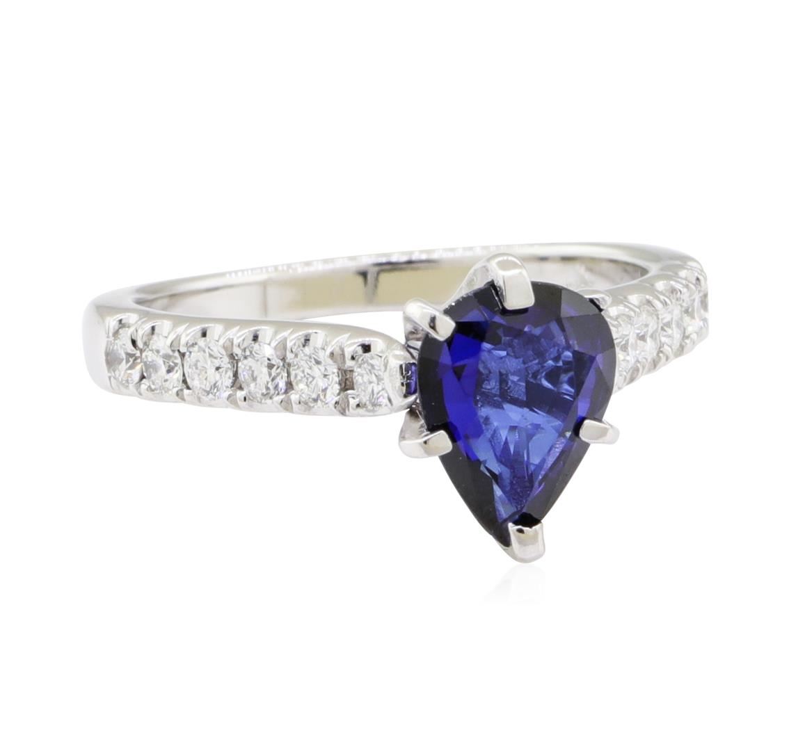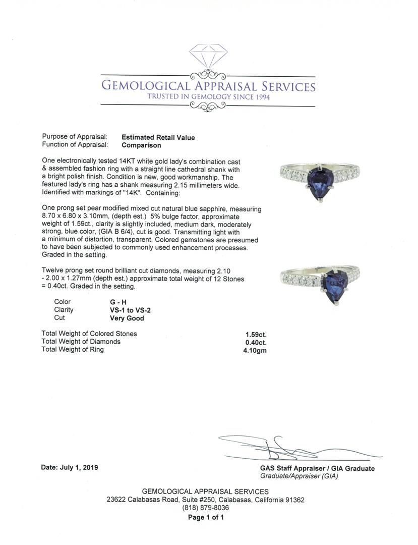 One electronically tested 14KT white gold lady's combination cast & assembled fashion ring with a straight line cathedral shank with a bright polish finish. The featured lady's ring has a shank measuring 2.15 millimeters wide. Identified with markings of '14K'. Condition is new, good workmanship. Containing: One prong set pear modified mixed cut natural blue sapphire, measuring 8.70 x 6.80 x 3.10mm, (depth est.) 5%. bulge factor, approximate weight of 1.59ct., clarity is slightly included, medium dark, moderately strong, blue color, (GIA B 6/4), cut is good. Transmitting light with a minimum of distortion, transparent. Colored gemstones are presumed to have been subjected to commonly used enhancement processes. Graded in the setting. Twelve prong set round brilliant cut diamonds, measuring 2.10 - 2.00 x 1.27mm (depth est.) approximate total weight of 12 Stones = 0.40 ct. Graded in the setting. Color G - H Clarity VS-1 to VS-2 Cut Very Good. Total Weight of Colored Stones 1.59ct.. Total Weight of Diamonds 0.40 ct.. Total Weight of Ring 4.10gm GAS Appraised at $4455.00. GAS Appraised.