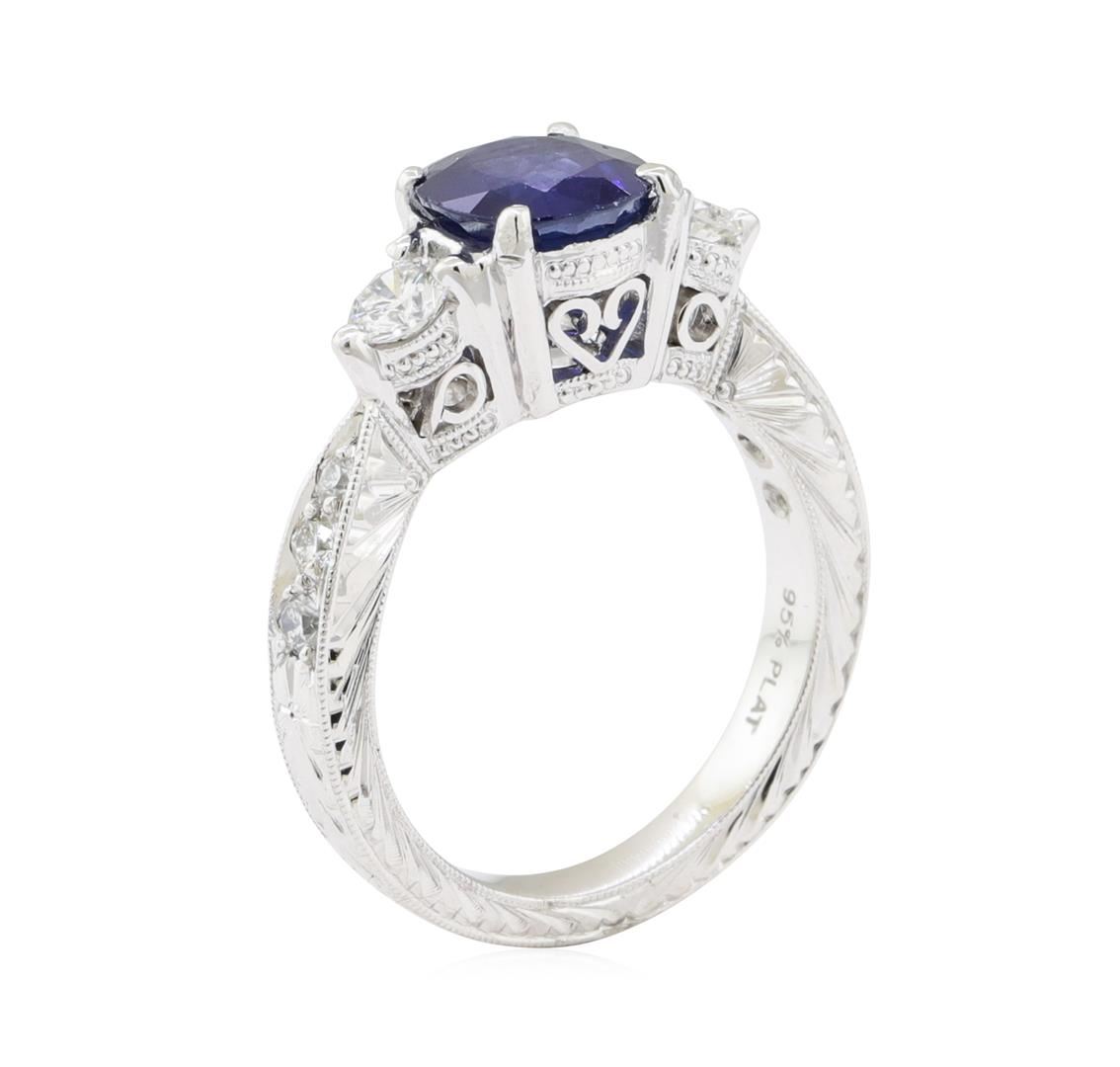 One electronically tested platinum lady's cast fashion ring with a three stone motif with a bright polish with milgrain detailing finish. The featured lady's ring has hand engraved detailing and a shank measuring 2.40 millimeters wide. Trademark is Coast. Identified with markings of 'PT 950'. Condition is new, good workmanship. Containing: One prong set oval modified mixed cut natural blue sapphire, measuring 7.34 x 6.69 x 3.66mm, (depth est.) approximate weight of 1.54ct., clarity is heavily included, medium dark, moderately strong, blue color, (GIA B 6/4), cut is good. Transmitting light somewhat diffusely, semi-transparent to translucent. Colored gemstones are presumed to have been subjected to commonly used enhancement processes. Graded in the setting. Two prong set round brilliant cut diamonds, measuring 3.40 - 3.38 x 2.03mm (depth est.) approximate total weight of 2 Stones = 0.30ct. Graded in the setting. Color F - G Clarity VS-1 to VS-2 Cut Very Good Six bead set round brilliant cut diamonds, measuring 2.00 - 1.75 x 1.17mm (depth est.) approximate total weight of 6 Stones = 0.15ct. Graded in the setting. Color F - G Clarity VS-1 to VS-2 Cut Very Good. Total Weight of Colored Stones 1.54ct.. Total Weight of Diamonds 0.45ct.. Total Weight of Ring 7.70gm GAS Appraised at  $4340.00. GAS Appraised at $4,340.00.