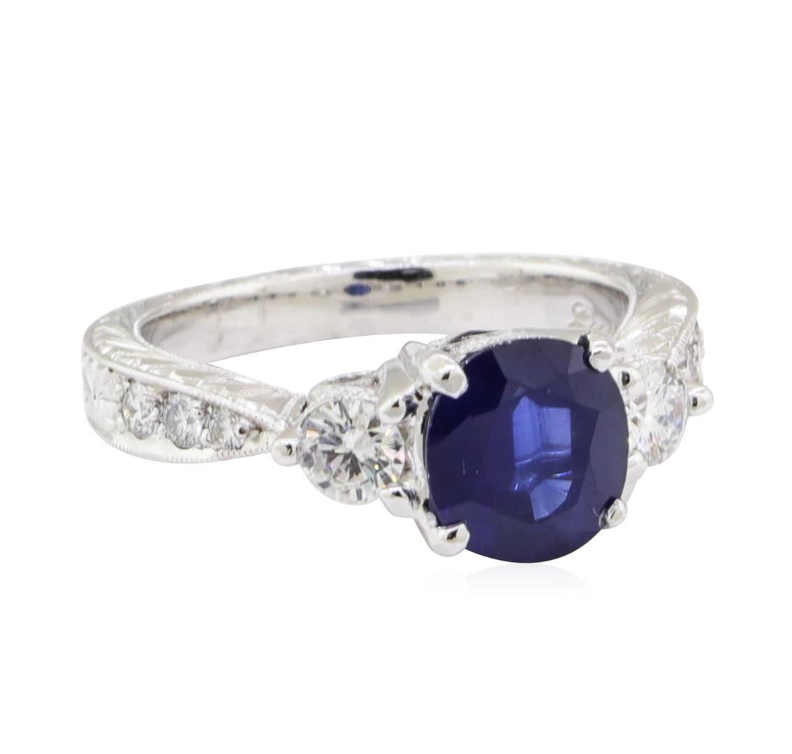 One electronically tested platinum lady's cast fashion ring with a three stone motif with a bright polish with milgrain detailing finish. The featured lady's ring has hand engraved detailing and a shank measuring 2.40 millimeters wide. Trademark is Coast. Identified with markings of 'PT 950'. Condition is new, good workmanship. Containing: One prong set oval modified mixed cut natural blue sapphire, measuring 7.34 x 6.69 x 3.66mm, (depth est.) approximate weight of 1.54ct., clarity is heavily included, medium dark, moderately strong, blue color, (GIA B 6/4), cut is good. Transmitting light somewhat diffusely, semi-transparent to translucent. Colored gemstones are presumed to have been subjected to commonly used enhancement processes. Graded in the setting. Two prong set round brilliant cut diamonds, measuring 3.40 - 3.38 x 2.03mm (depth est.) approximate total weight of 2 Stones = 0.30ct. Graded in the setting. Color F - G Clarity VS-1 to VS-2 Cut Very Good Six bead set round brilliant cut diamonds, measuring 2.00 - 1.75 x 1.17mm (depth est.) approximate total weight of 6 Stones = 0.15ct. Graded in the setting. Color F - G Clarity VS-1 to VS-2 Cut Very Good. Total Weight of Colored Stones 1.54ct.. Total Weight of Diamonds 0.45ct.. Total Weight of Ring 7.70gm GAS Appraised at $4340.00. GAS Appraised at $4,340.00.