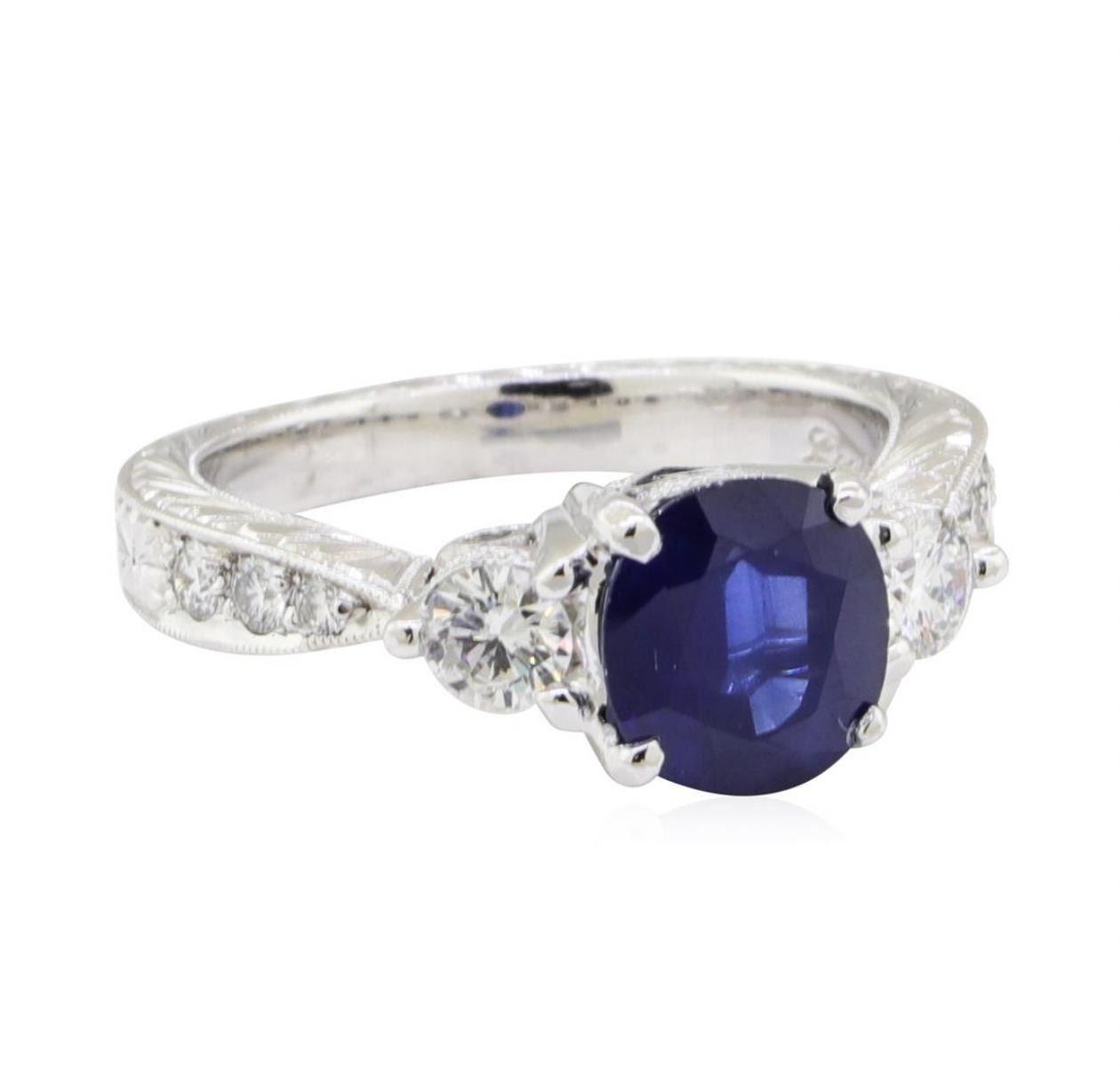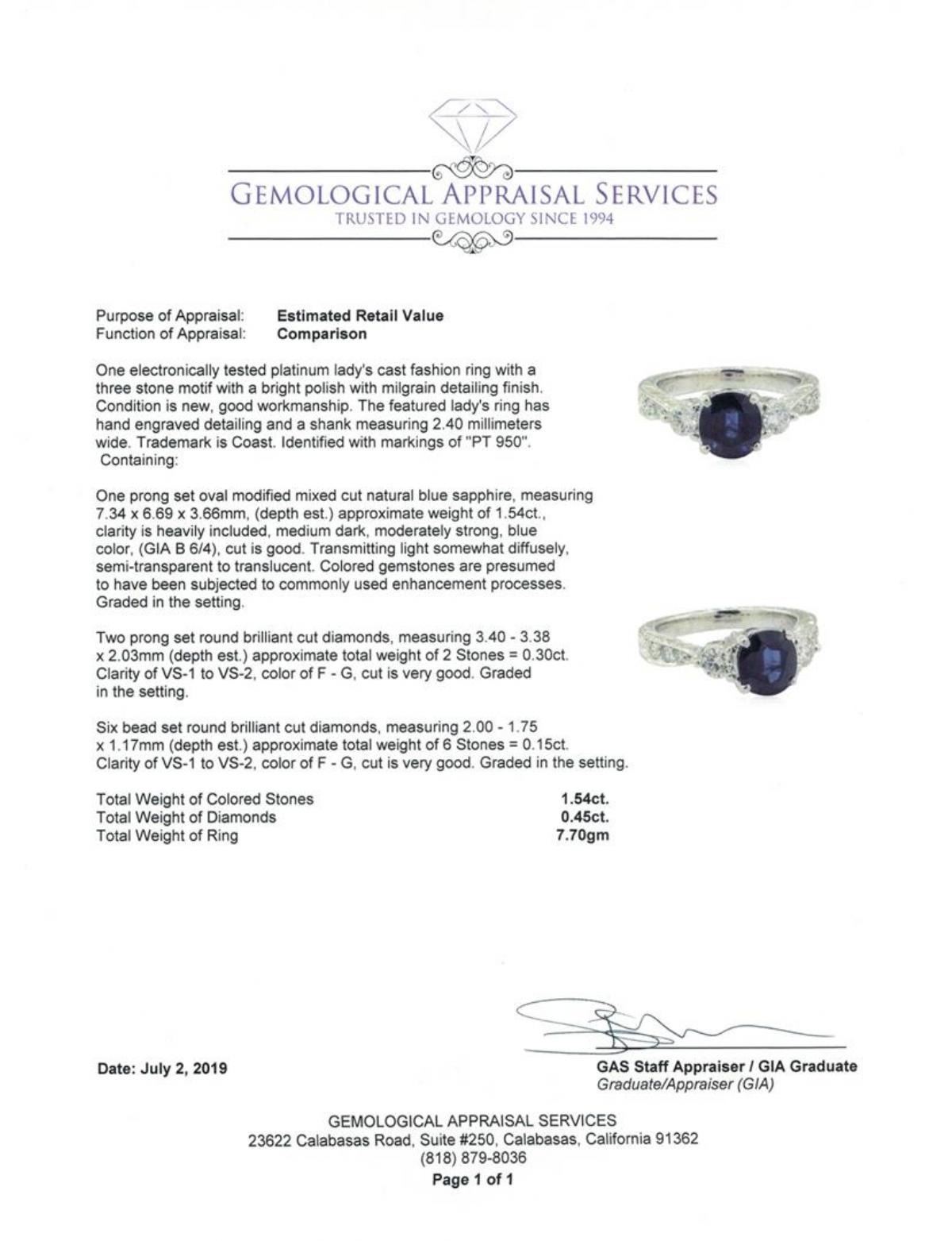 One electronically tested platinum lady's cast fashion ring with a three stone motif with a bright polish with milgrain detailing finish. The featured lady's ring has hand engraved detailing and a shank measuring 2.40 millimeters wide. Trademark is Coast. Identified with markings of 'PT 950'. Condition is new, good workmanship. Containing: One prong set oval modified mixed cut natural blue sapphire, measuring 7.34 x 6.69 x 3.66mm, (depth est.) approximate weight of 1.54ct., clarity is heavily included, medium dark, moderately strong, blue color, (GIA B 6/4), cut is good. Transmitting light somewhat diffusely, semi-transparent to translucent. Colored gemstones are presumed to have been subjected to commonly used enhancement processes. Graded in the setting. Two prong set round brilliant cut diamonds, measuring 3.40 - 3.38 x 2.03mm (depth est.) approximate total weight of 2 Stones = 0.30ct. Graded in the setting. Color F - G Clarity VS-1 to VS-2 Cut Very Good Six bead set round brilliant cut diamonds, measuring 2.00 - 1.75 x 1.17mm (depth est.) approximate total weight of 6 Stones = 0.15ct. Graded in the setting. Color F - G Clarity VS-1 to VS-2 Cut Very Good. Total Weight of Colored Stones 1.54ct.. Total Weight of Diamonds 0.45ct.. Total Weight of Ring 7.70gm GAS Appraised at $4340.00. GAS Appraised.