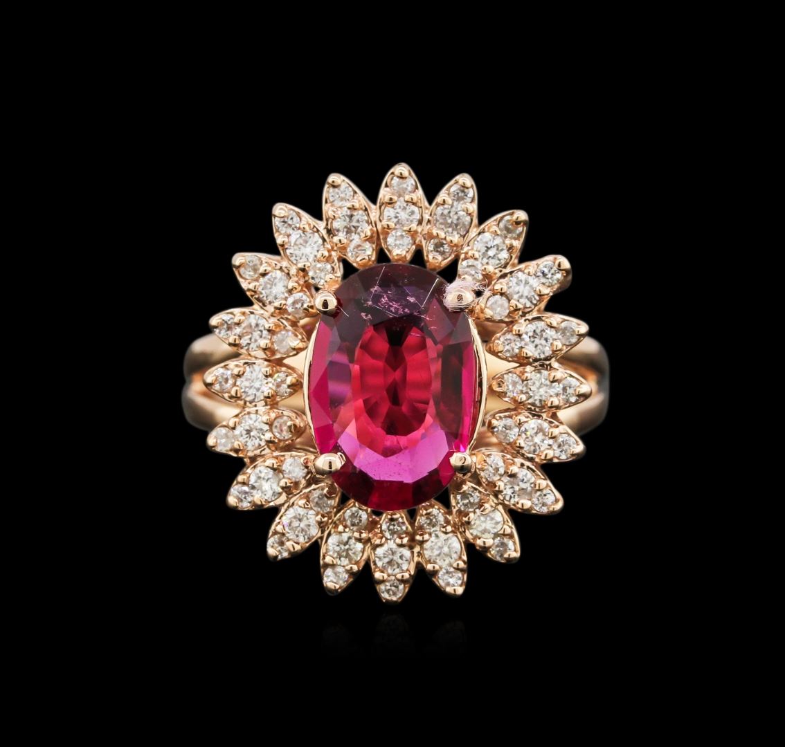 One ring featuring: 14KT rose gold weighing 6.70 grams containing one ruby center stone with a total weight of 1.99ct and 60 diamonds with a total weight of 0.54ct.