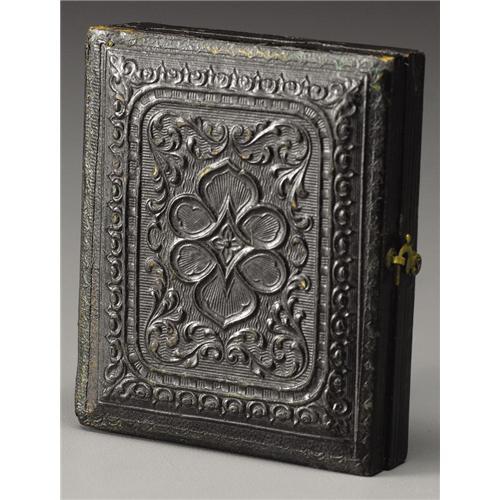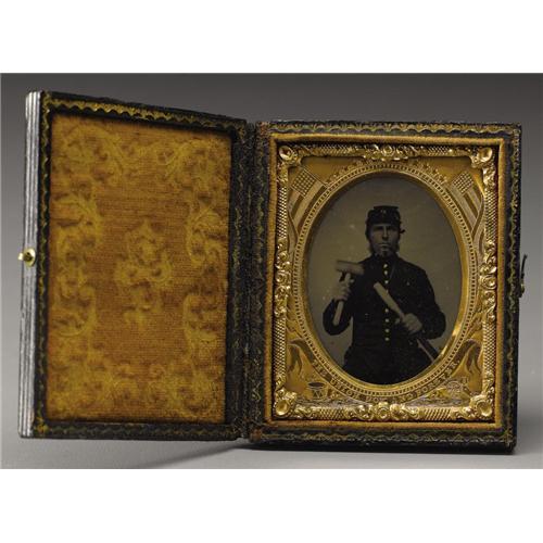 <B>1/9th Plate Tintype of Unidentified Union Private Holding a Mallet and Tent Peg.</B></I> A unique image that clearly shows a rather determined look on the Union soldier's face. Dressed in the standard uniform and kepi, the image retains the original gilt brass frame and exceptional military-themed mat housed in a complete leather case. The image is sharp with just a hint of crazing to a small section of the surface. An interesting image that is a departure from the usual staged poses with muskets, swords and pistols.<BR><BR><b>Shipping:</b> Miscellaneous Collectibles, Smal (<a target="_blank" href="http://www.heritageauctions.com/common/shipping.php">view shipping information</a>)