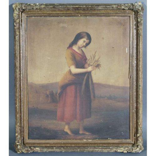 1 AMERICAN SCHOOL<BR>Girl with sheeth of wheat<BR>30"x25" oil on canvas<BR>late 19th century <BR>CONDITION REPORT: dirty, 2 holes, 2" repair.<BR>PACKING AND SHIPPING - see recommended.