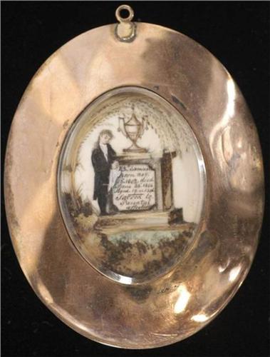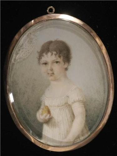 1 AMERICAN SCHOOL PORTRAIT MINIATURE OF A CHILD, 63mm x 52mm oval, identified verso as E.S. Samuel, born 1802, CONDITION: upper left area obscured, we believe this is under glass and not image, but haven't taken it apart, reverse has some paint loss at bottom, PACKING AND SHIPPING (excluding insurance) AVAILABLE WITHIN CONTINENTAL U.S. BY FAIRFIELD AUCTION FOR $20 . BUYER MAY ALSO PICK-UP OR USE A 3RD PARTY FOR PACKING AND SHIPPING