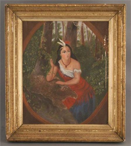 1 AMERICAN SCHOOL, primative portrait of an Indian maiden, 24"x20" o/c, circa 1870, flaking, pinhole,