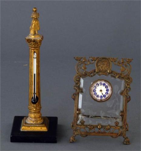 1 ART NOUVEAU DESK CLOCK with bronze frame and etched glass and easle back, 5" high together with a DESK THERM- OMETER, 7" high circa 1900, packing and shipping $30