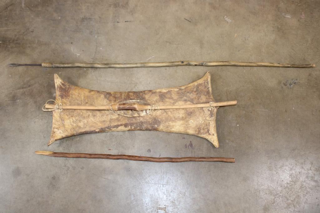 1 African Rawhide SHIELD and 2 SPEARS. The taller Spear measures 50" Long and the Shield measures 29" Long x 12" Wide. (ONE$) COLLECTIBLE AFRICAN ARTIFACTS AND WEAPONS