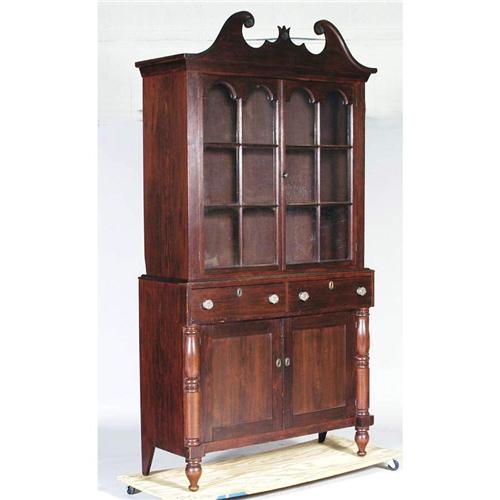 1 BERGEN COUNTY PINE CUPBOARD with glazed top section having arched tops early 19th century PACKING AND SHIPPING must be handled by 3rd party shipper). CONDITION REPORT: excellent appearance, refinished, repair to cornice.