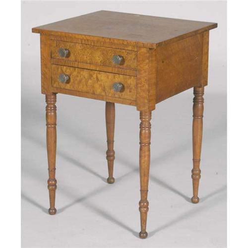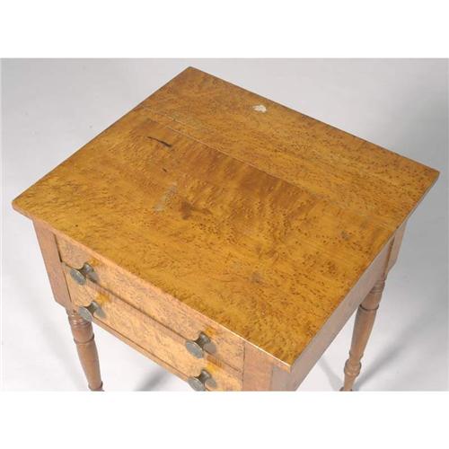 1 BIRDS-EYE MAPLE COUNTRY SHERATON STAND with two drawers 19th century PACKING AND SHIPPING must be handled by 3rd party shipper. CONDITION REPORT: two splits to top, stains and scuff to top.