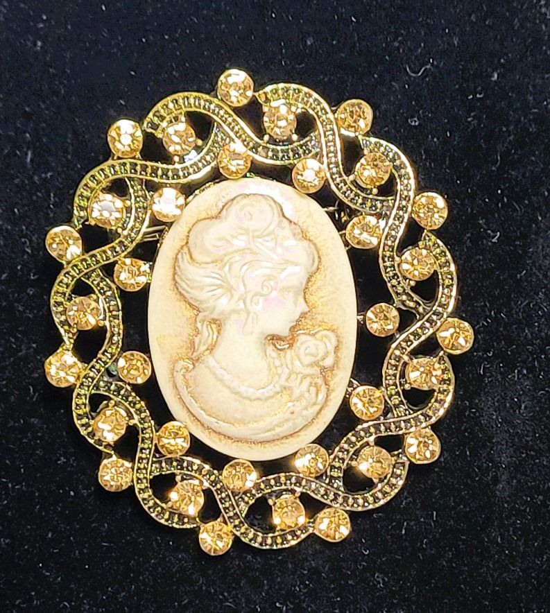 CAMEO BROOCH WITH CRYSTAL ACCENTS. JEWELRY