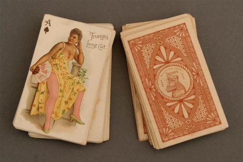 1 BURLESQUE PLAYING CARDS, Trumps Long Cut, 3 7/8"x2 1/2", one full deck with joker and about 30 extra cards, a few minor creases and light wear to deck, circa 1890, packing and shipping $20