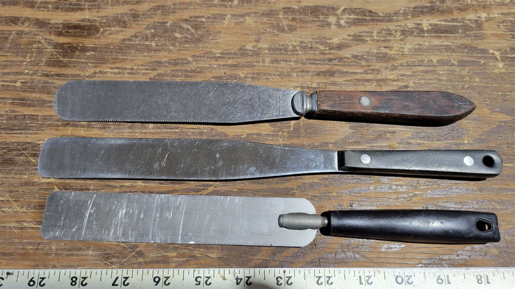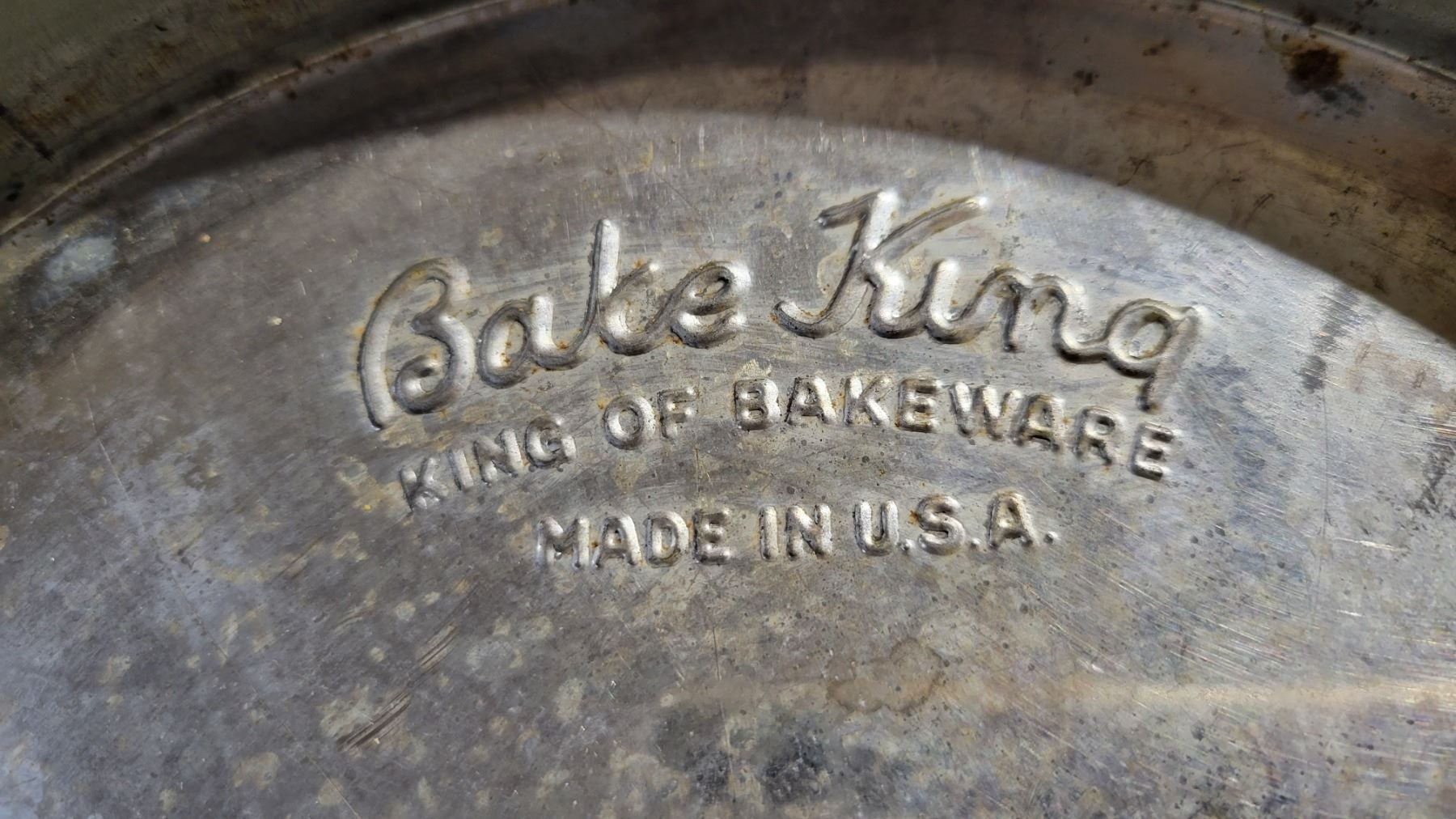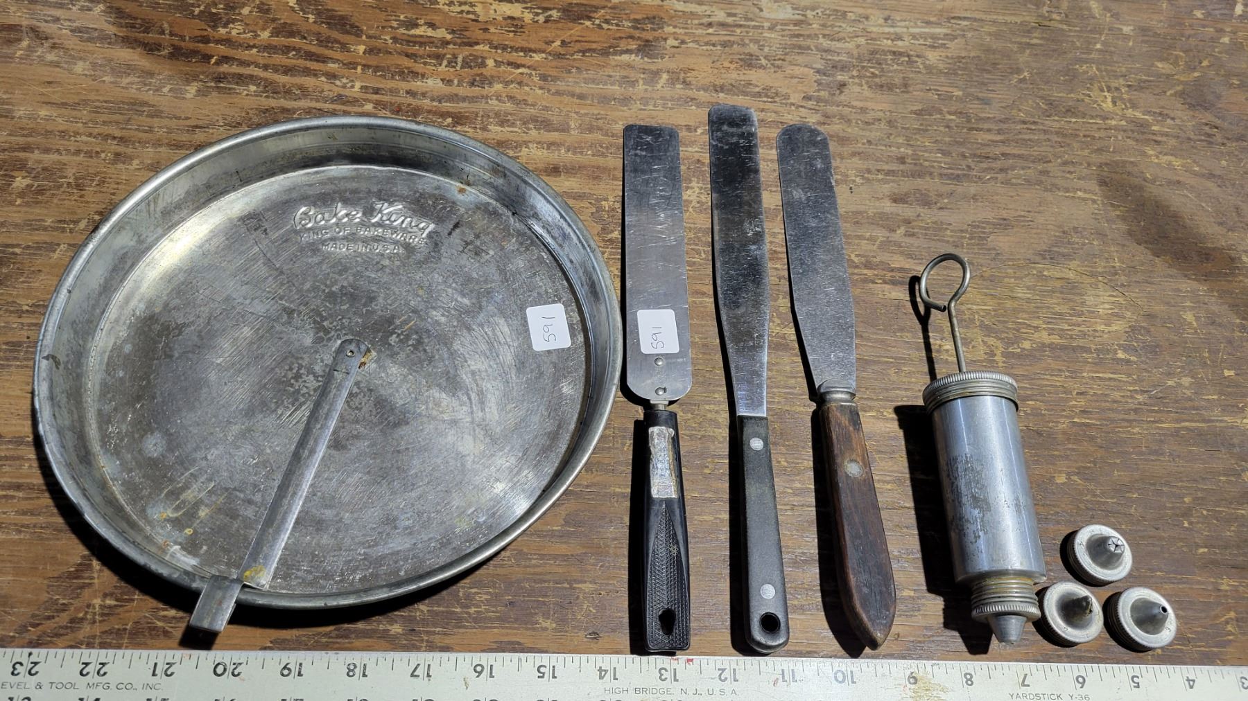 1 “Bake King” Cake Pan, 3 icing spatulas + vintage cake icing tool with 4 different tips