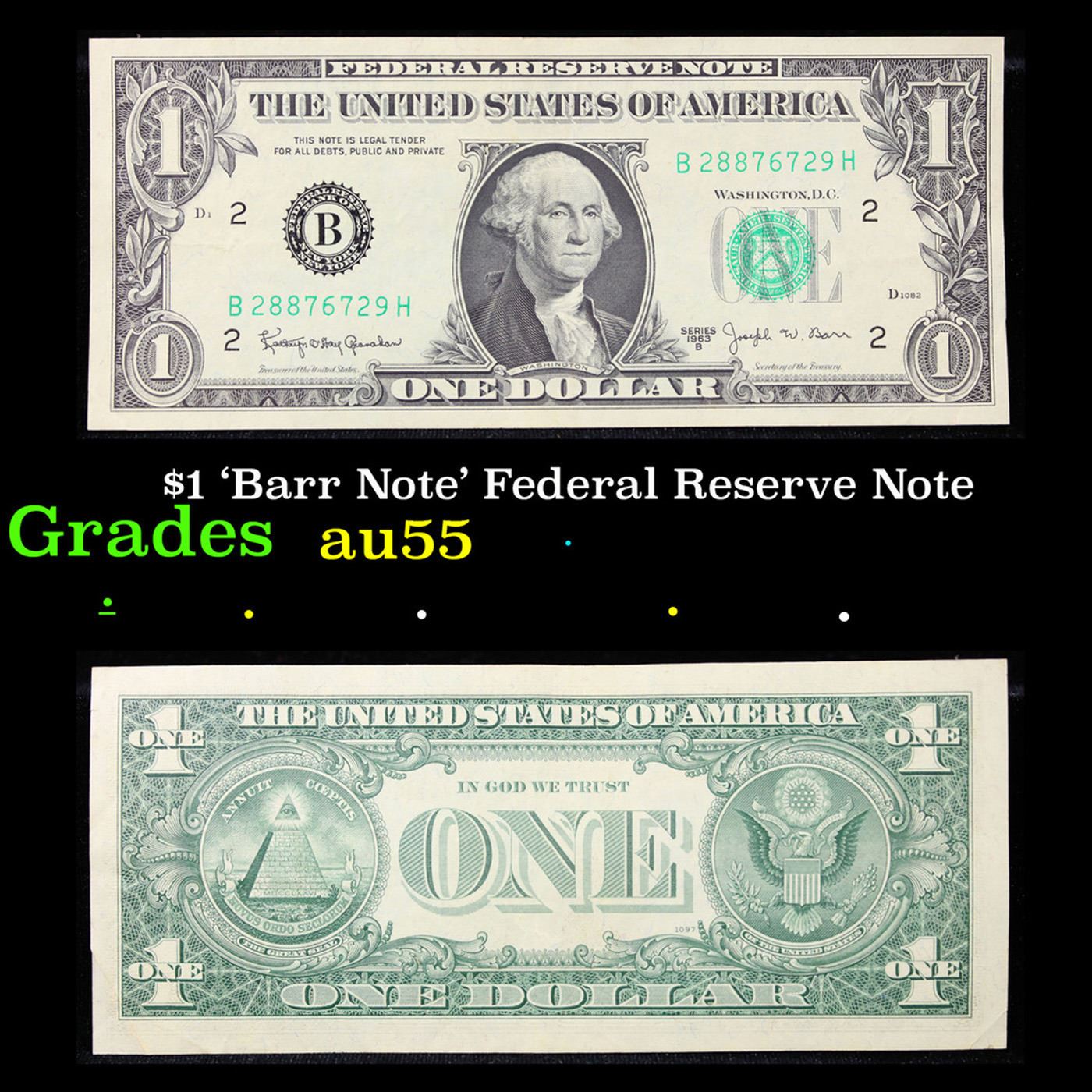 $1 'Barr Note' Federal Reserve Note Grades Choice AU. Among the most sought-after U.S. paper money of the late 1960s are the short-lived "Barr" Notes. These distinctive $1 Federal Reserve Notes bear the signature of Joseph W. Barr, who served as Secretary of the Treasury during the last 28 days of President Lyndon B. Johnson's administration. Barr was replaced when President Nixon chose a successor. Due to Barr's short term, his signature appeared only on the $1 notes of Series 1963B.