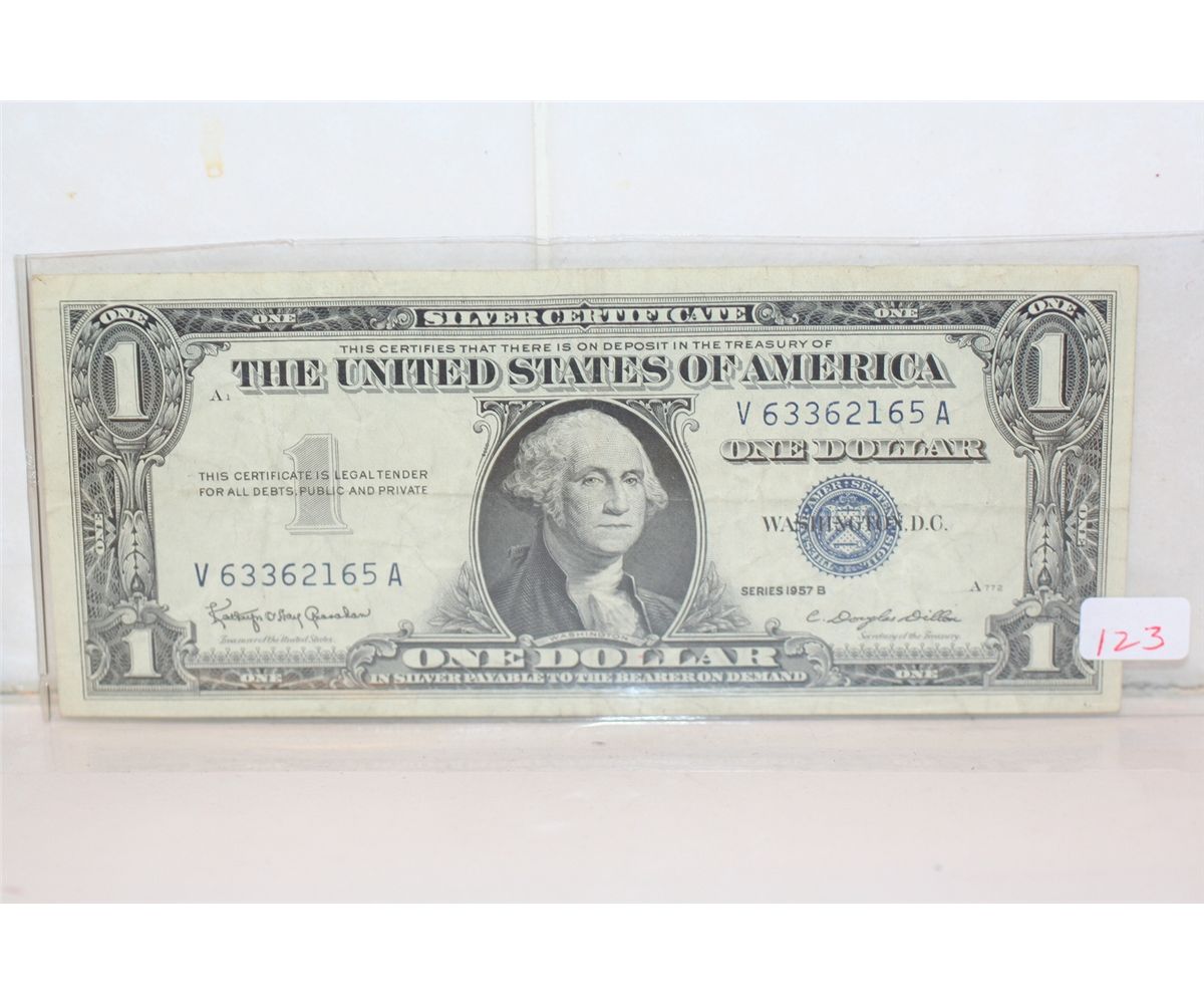 This lot is a $1 blue seal silver certificate series 1957-b