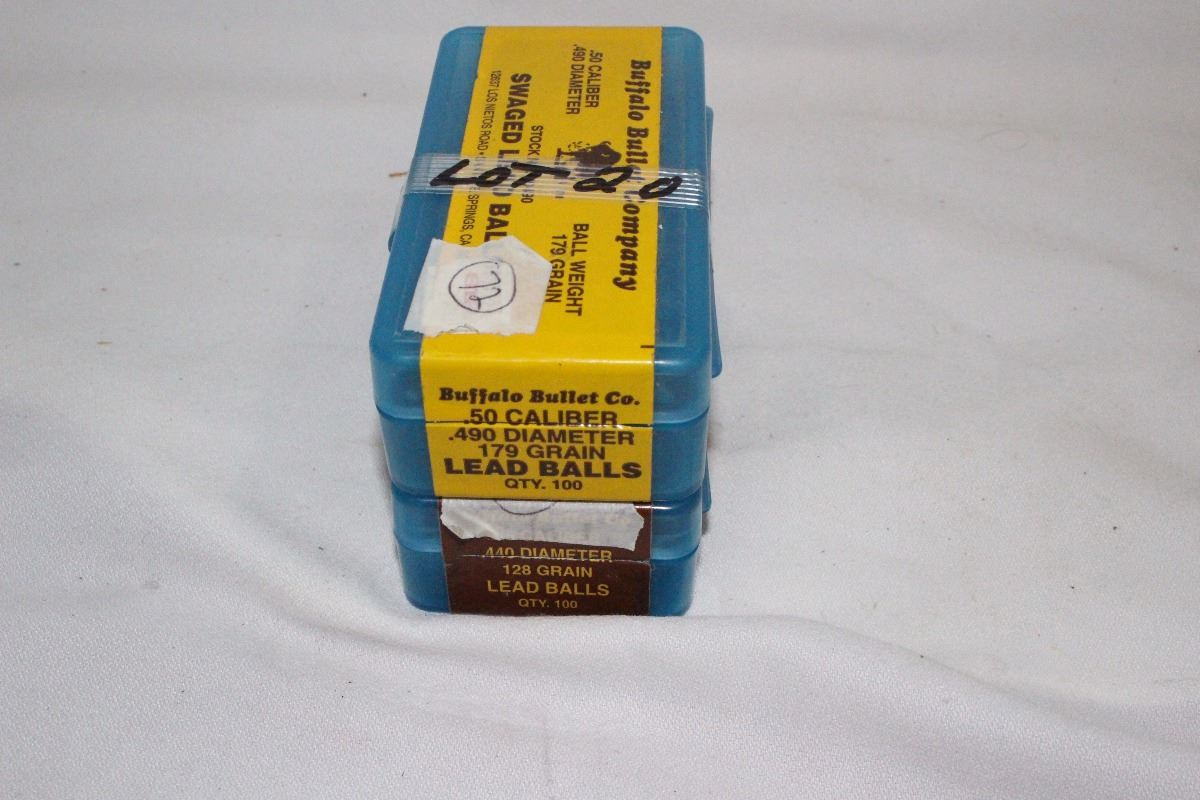 1 Box Buffalo Bullets, 45 cal. Lead Balls, 128 Grain & 1 Box Buffalo Bullets, 50 cal. Lead Balls 179 Grain