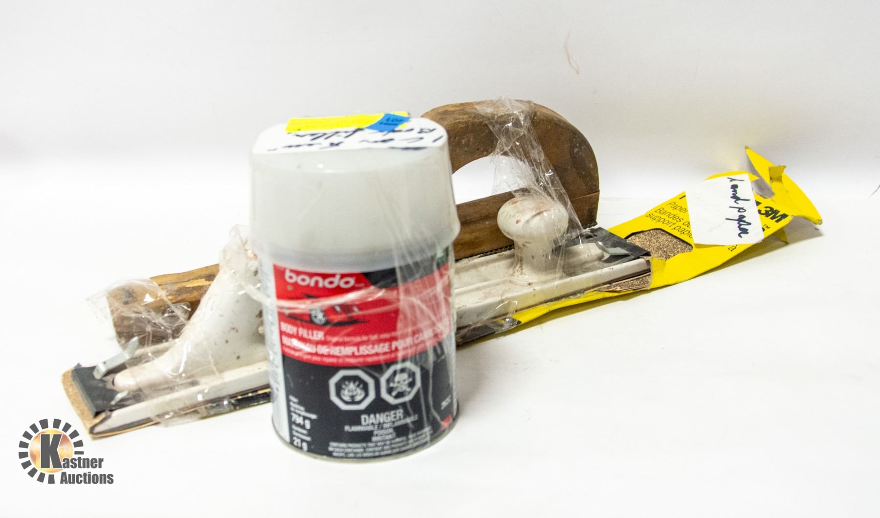 1 CAN OF BODY FILLER (NEW), SANDER AND FILE
