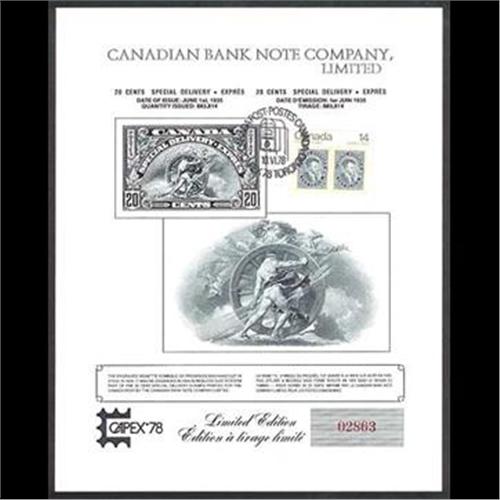 Card 3: "Canadian Bank Note Company, Limited" with illustrations of "20 Cents Special Delivery / Date of issue: June 1st, 1935" and an engraving below with inscription "The engraved vignette symbolic of progress was hand cut in steel in 1926. It was re-engraved in 1935 in reduced size to form part of the 20 cent special delivery stamps printed for the Canada Post by the Canadian Bank Note Company Limited." At bottom "Limited Edition" with CAPEX 78 insignia.