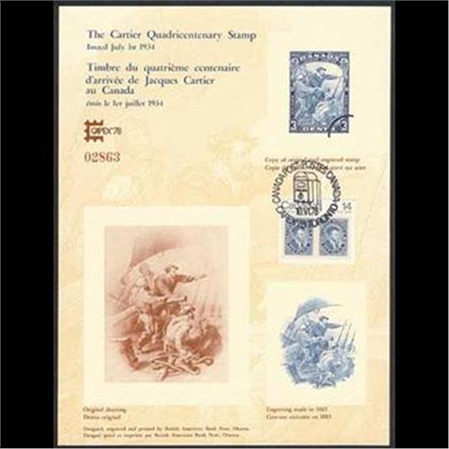 Card 2: "The Cartier Quadricentenary Stamp / Issued July 1st 1934" with "Copy of original steel engraved stamp", "Original drawing" and "Engraving made in 1885." Lower left inscription reads "Designed, engraved and printed by British American Bank Note, Ottawa."