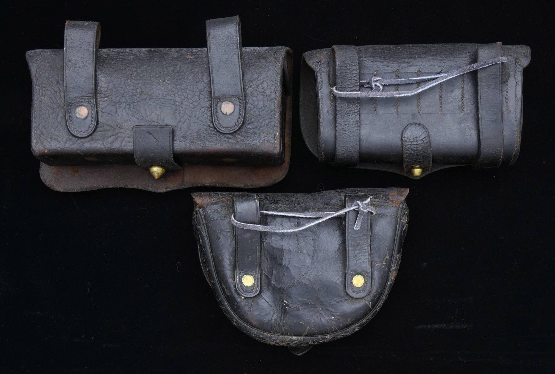 This lot consists of 1 black bridle leather Civil War carbine cartridge box with an interior wooden holder for 20 rimfire cartridges. There are no maker’s marks on the box. / 1 Indian War period Dyer cartridge pouch with an embossed "US" in an oval on the front. Pouch has a front-mounted finial with a brass escutcheon on the flap to secure to the finial. / 1 Indian War period 2nd Model Hagner cartridge box with an impressed "US" in an oval on the flap. The interior shows a total of 24 canvas loops. Belt loops and the securing thong are intact. CONDITION: Civil War box shows flexing and some flaking but is generally solid. The Dyer box has a weak impression of the oval on the front and shows moderate wear overall. Hagner box shows light wear. (02-23117/BF). $300-400.