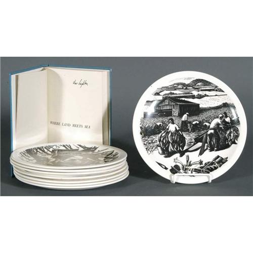 1 CLARE LEIGHTON set of 8 10" plates, Wedgwood, with the artist's designs, together with a book signed by the artist "Where Land Meets Sea" PACKING AND SHIPPING (excluding insurance) by Fairfield Auction to points within the Continental U.S.A. (international must be handled by 3rd party shipper) $40. CONDITION REPORT: excellent, book is lacking jacket.