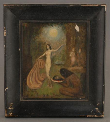 1 CLAUDE BUCK 8 1/2" x 7 1/4" sybolist period scene titled verso, "Dance of ...Salome" flaking ur, packing and shipping $30