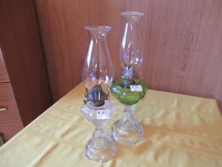 1 CLEAR GLASS & 1 GREEN/CLEAR BEADED QUEEN HEART OIL LAMPS WITH CHIMNEYS