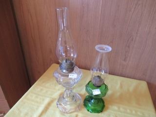 1 CLEAR GLASS & 1 GREEN/CLEAR BEADED QUEEN HEART OIL LAMPS WITH CHIMNEYS