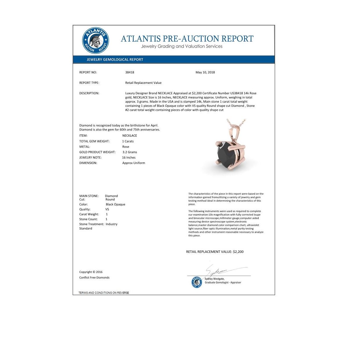 REF-40M4H -38418 ---- 1 CTW Black Diamond Designer Necklace 14K Rose Gold ---- Luxury Designer Brand NECKLACE Appraised at $2,200 Certificate Number US38418 14k Rose gold, NECKLACE Size is 16 Inches, NECKLACE measuring approx. Uniform, weighing in total approx. 3 grams. Made in the USA and is stamped 14k, Main stone 1 carat total weight containing 1 pieces of Black Opaque color with VS quality Round shape cut Diamond , Stone #2 carat total weight containing pieces of color with quality shape cut