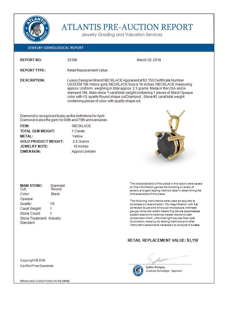 REF-52H4A -32356 ---- 1 CTW Black Diamond Designer Necklace 18K Yellow Gold ---- Luxury Designer Brand NECKLACE Appraised at $3,150 Certificate Number US32356 18k Yellow gold, NECKLACE Size is 16 Inches, NECKLACE measuring approx. Uniform, weighing in total approx. 2.3 grams. Made in the USA and is stamped 18k, Main stone 1 carat total weight containing 1 pieces of Black Opaque color with VS quality Round shape cut Diamond , Stone #2 carat total weight containing pieces of color with quality shape cut