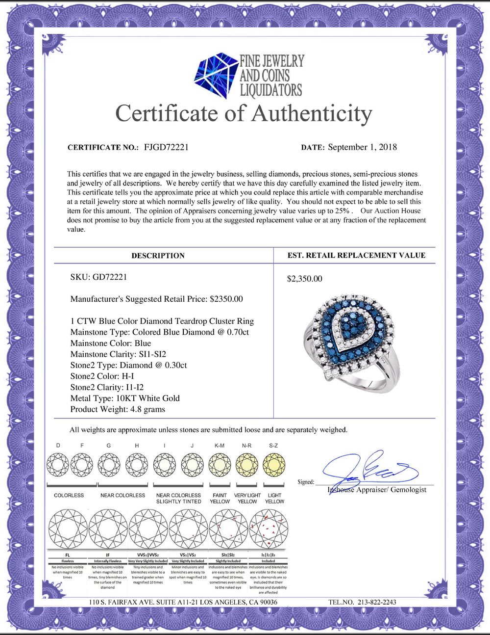 REF-59M9H- SKU: GD72221 ---- 1 CTW Blue Color Diamond Teardrop Cluster Ring 10KT White Gold