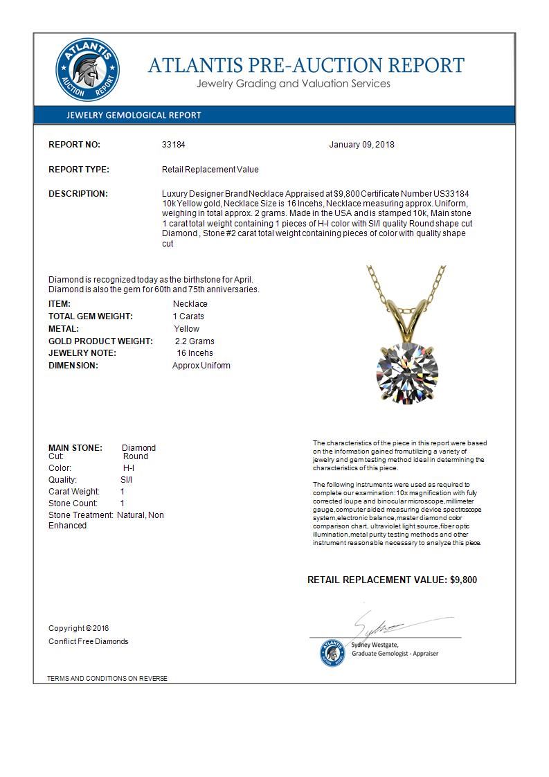 REF-147M2H -33184 ---- 1 CTW Certified H-SI/I Quality Diamond Solitaire Necklace 10K Yellow Gold ---- Luxury Designer Brand Necklace Appraised at $9,800 Certificate Number US33184 10k Yellow gold, Necklace Size is 16 Incehs, Necklace measuring approx. Uniform, weighing in total approx. 2 grams. Made in the USA and is stamped 10k, Main stone 1 carat total weight containing 1 pieces of H-I color with SI/I quality Round shape cut Diamond , Stone #2 carat total weight containing pieces of color with quality shape cut