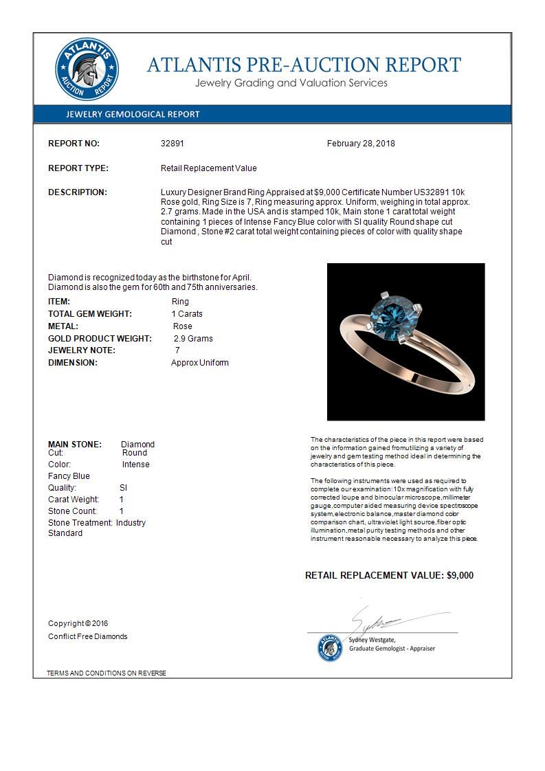 REF-136N4Y -32891 ---- 1 CTW Certified Intense Blue SI Diamond Solitaire Engagement Ring 10K Rose Gold ---- Luxury Designer Brand Ring Appraised at $9,000 Certificate Number US32891 10k Rose gold, Ring Size is 7, Ring measuring approx. Uniform, weighing in total approx. 2.7 grams. Made in the USA and is stamped 10k, Main stone 1 carat total weight containing 1 pieces of Intense Fancy Blue color with SI quality Round shape cut Diamond , Stone #2 carat total weight containing pieces of color with quality shape cut