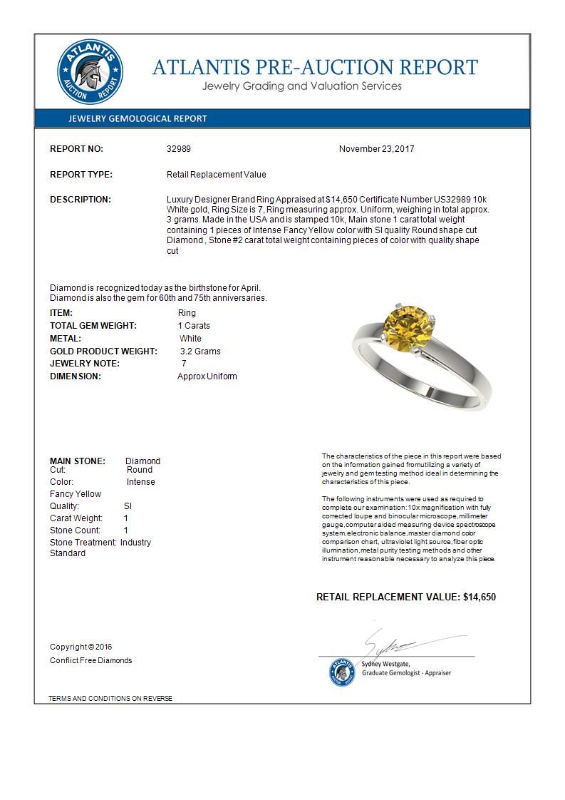 REF-199H5A -32989 ---- 1 CTW Certified Intense Yellow SI Diamond Solitaire Engagement Ring 10K White Gold ---- Luxury Designer Brand Ring Appraised at $14,650 Certificate Number US32989 10k White gold, Ring Size is 7, Ring measuring approx. Uniform, weighing in total approx. 3 grams. Made in the USA and is stamped 10k, Main stone 1 carat total weight containing 1 pieces of Intense Fancy Yellow color with SI quality Round shape cut Diamond , Stone #2 carat total weight containing pieces of color with quality shape cut