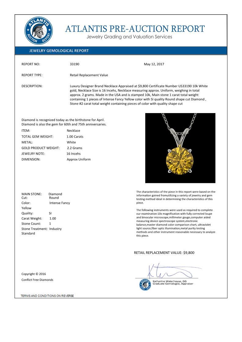 1 CTW Certified Intense Yellow SI Diamond Solitaire Necklace 10K White Gold ---- Luxury Designer Brand Necklace Appraised Retail Price at $9,800 ---- SKU Number US33190 10k White gold Necklace Size is 16 Incehs, Necklace measuring approx. Uniform, weighing in total approx. 2 grams. Made in the USA and is stamped 10k, Main stone 1.00 carat total weight containing 1 pieces of Intense Fancy Yellow color with SI quality Round shape cut Diamond , Stone #2 carat total weight containing pieces of color with quality shape cut