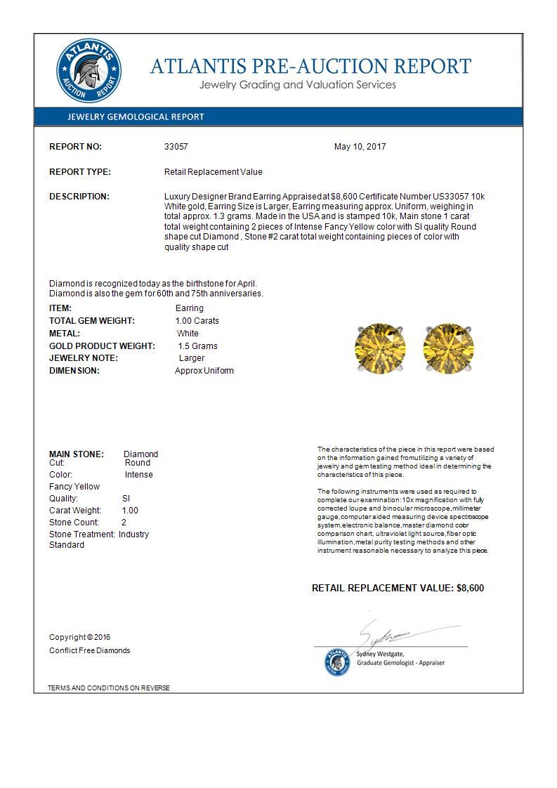 1 CTW Certified Intense Yellow SI Diamond Solitaire Stud Earrings 10K White Gold ---- Luxury Designer Brand Earring Appraised Retail Price at $8,600 ---- SKU Number US33057 10k White gold Earring Size is Larger, Earring measuring approx. Uniform, weighing in total approx. 1.3 grams. Made in the USA and is stamped 10k, Main stone 1.00 carat total weight containing 2 pieces of Intense Fancy Yellow color with SI quality Round shape cut Diamond , Stone #2 carat total weight containing pieces of color with quality shape cut