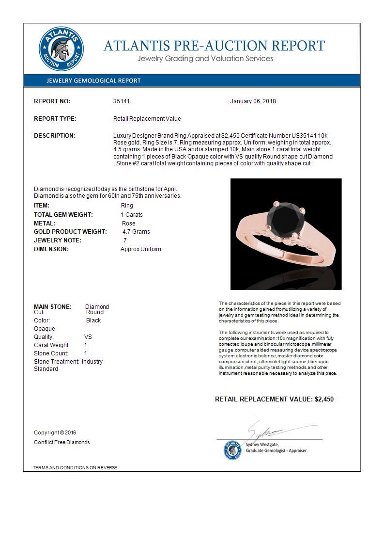 REF-44W5F -35141 ---- 1 CTW Certified VS Black Diamond Solitaire Ring 10K Rose Gold ---- Luxury Designer Brand Ring Appraised at $2,450 Certificate Number US35141 10k Rose gold, Ring Size is 7, Ring measuring approx. Uniform, weighing in total approx. 4.5 grams. Made in the USA and is stamped 10k, Main stone 1 carat total weight containing 1 pieces of Black Opaque color with VS quality Round shape cut Diamond , Stone #2 carat total weight containing pieces of color with quality shape cut