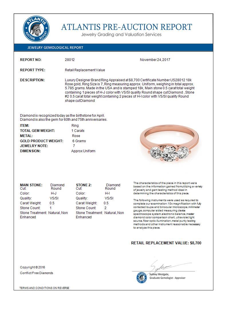 REF-158W4F -28012 ---- 1 CTW Certified VS/SI Diamond 3 Stone Solitaire Ring 18K Rose Gold ---- Luxury Designer Brand Ring Appraised at $8,700 Certificate Number US28012 18k Rose gold, Ring Size is 7, Ring measuring approx. Uniform, weighing in total approx. 5.785 grams. Made in the USA and is stamped 18k, Main stone 0.5 carat total weight containing 1 pieces of H-J color with VS/SI quality Round shape cut Diamond , Stone #2 0.5 carat total weight containing 2 pieces of H-I color with VS/SI quality Round shape cut Diamond