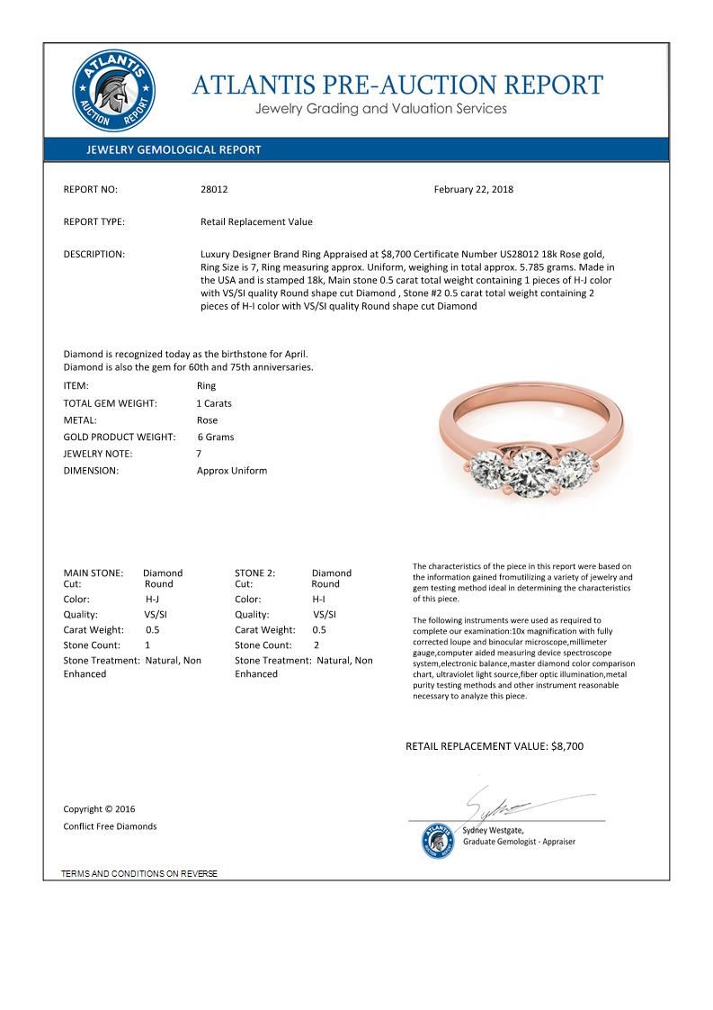 REF-158W4F -28012 ---- 1 CTW Certified VS/SI Diamond 3 Stone Solitaire Ring 18K Rose Gold ---- Luxury Designer Brand Ring Appraised at $8,700 Certificate Number US28012 18k Rose gold, Ring Size is 7, Ring measuring approx. Uniform, weighing in total approx. 5.785 grams. Made in the USA and is stamped 18k, Main stone 0.5 carat total weight containing 1 pieces of H-J color with VS/SI quality Round shape cut Diamond , Stone #2 0.5 carat total weight containing 2 pieces of H-I color with VS/SI quality Round shape cut Diamond